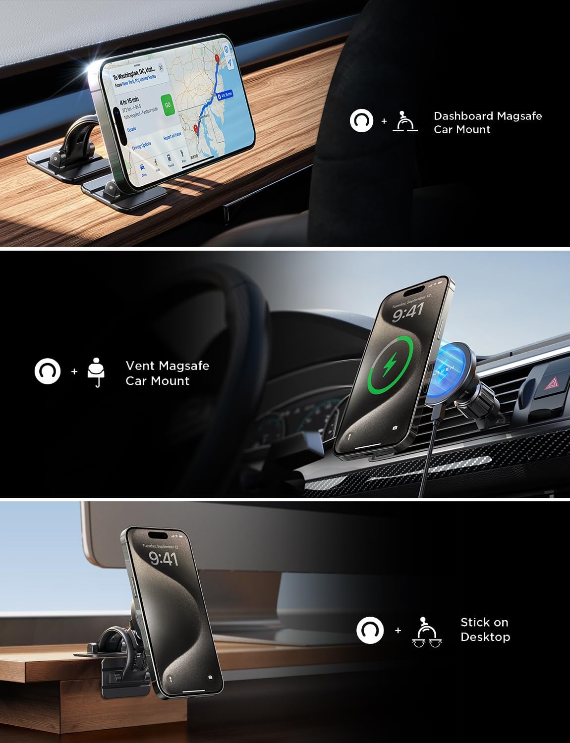 ⚡4-in-1 Secure Dashboard Fit and Vent Installation: The 2 adjustable ultra-durable G23F adhesive base design allows our phone mount for car wireless charger for iPhone to adhere firmly to your dashboard. It remains stable even on bumpy rides, ensuring the steadiness of your phone. In addition, our vent MagSafe car charger holder mount can be easily installed onto your car’s air vent, offering you a range of installation options to meet various usage scenarios