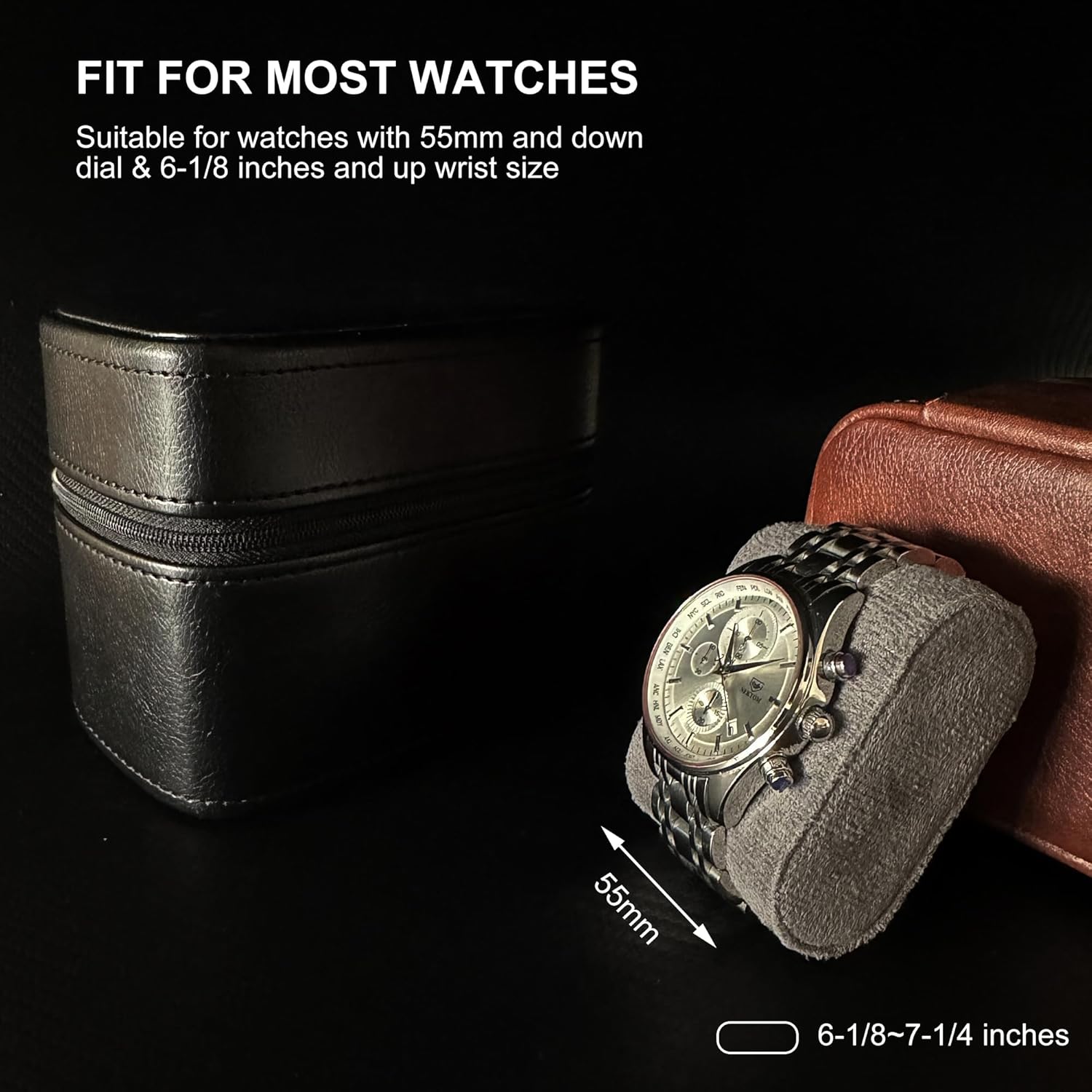 FIT FOR MOST WATCHES. The measurement around the cushion where the watch would be is 7-1/4 inches. But the cushions are soft and move to approximately 6-1/8 inches. Suitable for watches with 55mm and down dial & 6-1/8 inches and up wrist size.