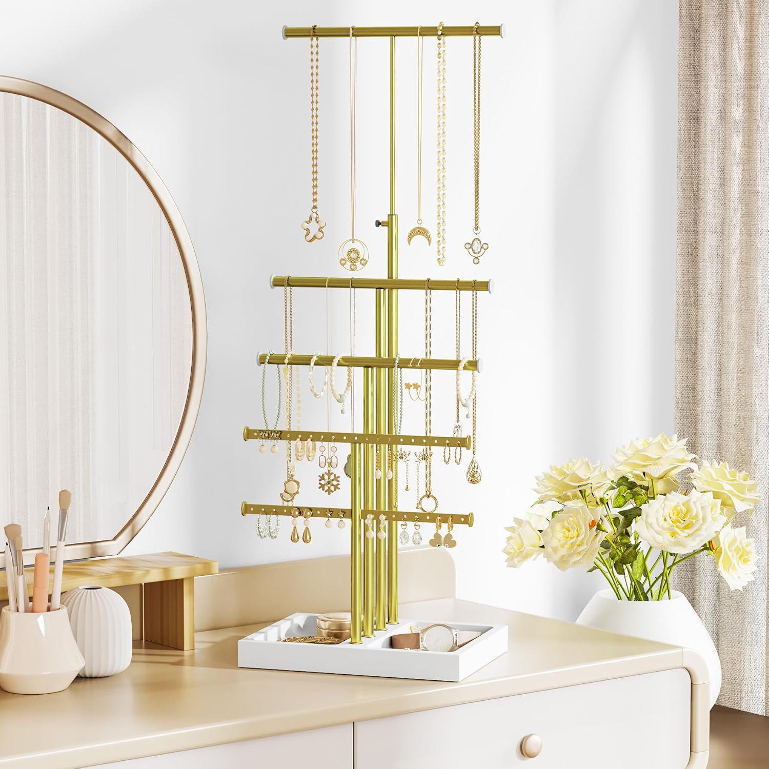 Features 5-tier design, the tallest metal rods can be extended to 25 inches for long necklaces, which is the advantage of our jewelry stand. The trays at the base for holding rings and other items. Great for organizing your jewelry.