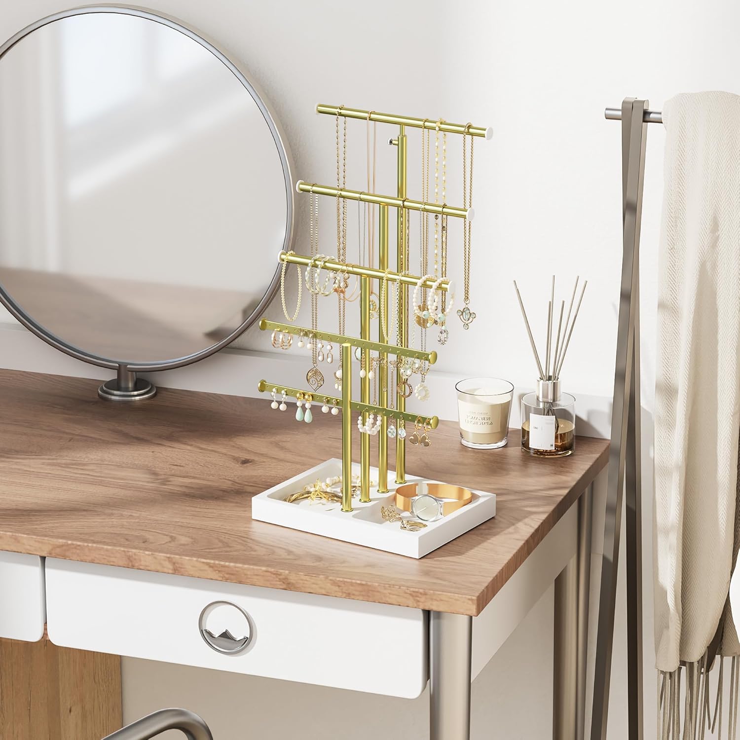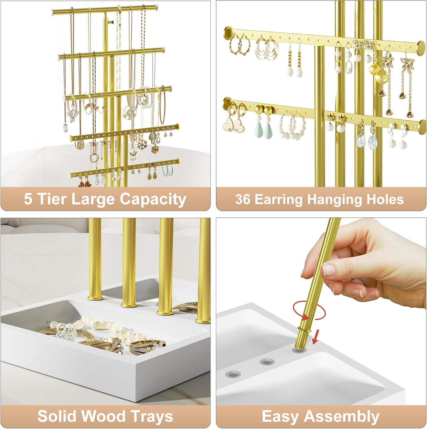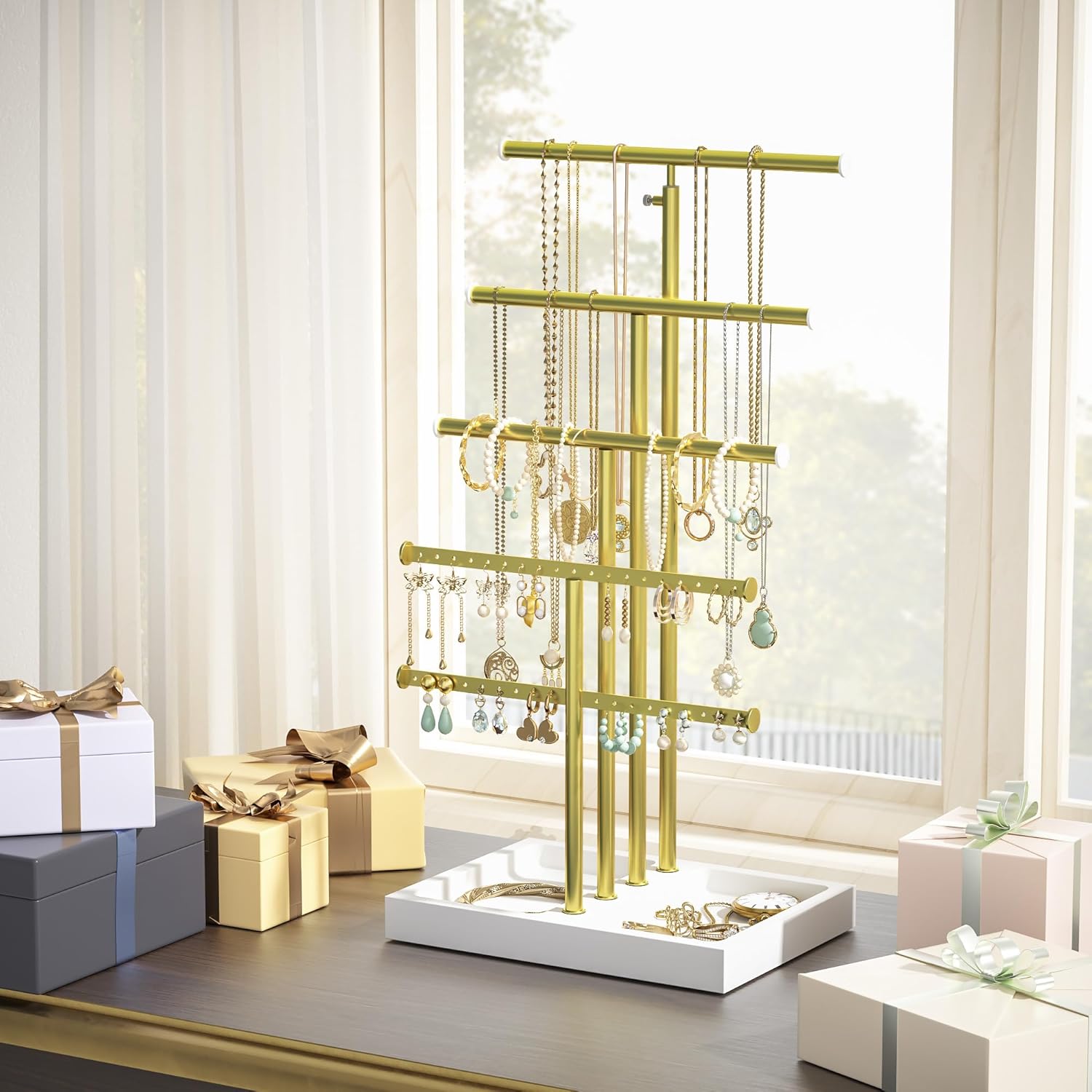 Love-KANKEI Jewelry Organizer Stand,5 Tier Large Necklace Holder with Wood Base,Jewelry holder stand Tree for Display,Bracelets Earrings Rings,Height Adjustable Gift White and Gold