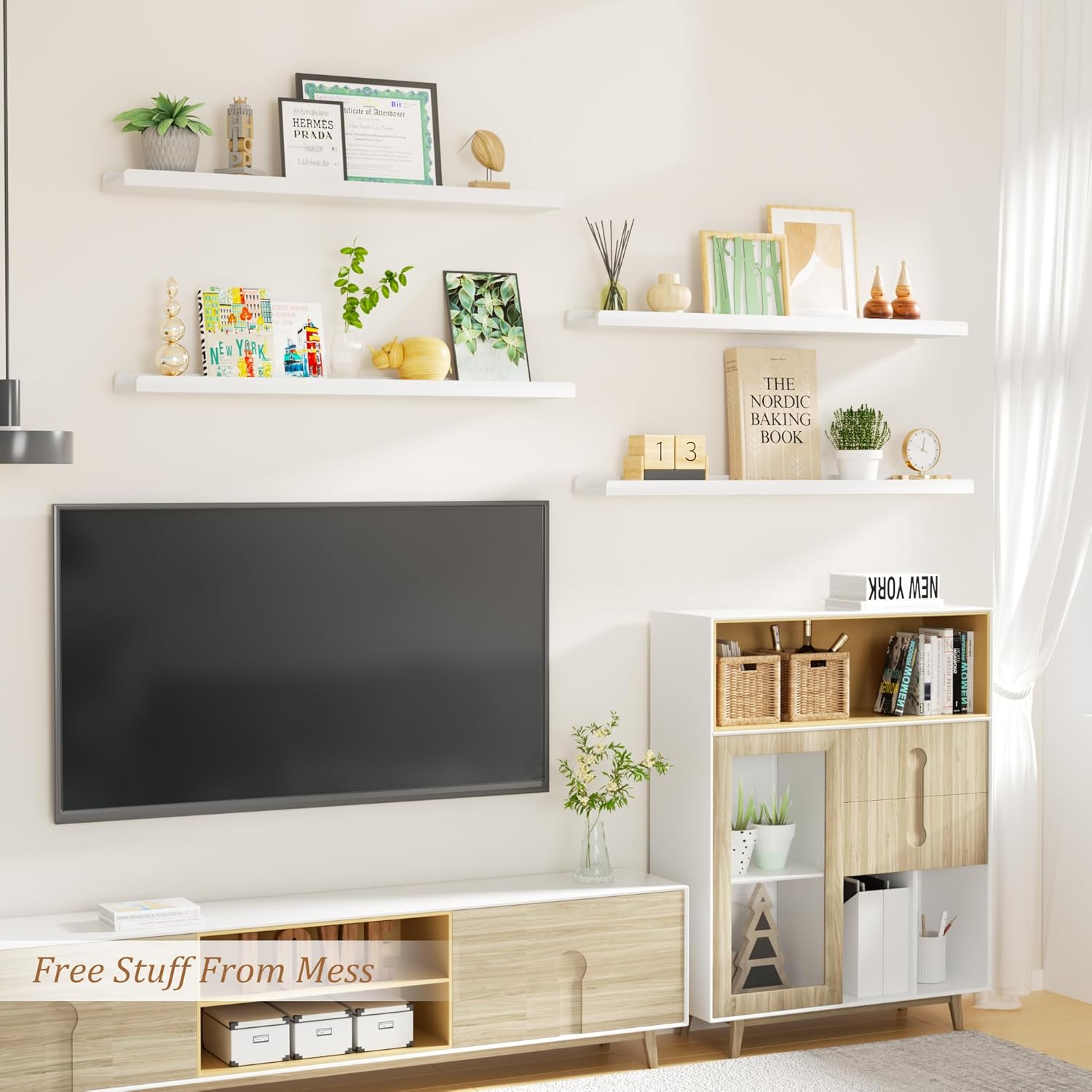 Beautiful and useful display shelves that can be a great tool for organizing your living room items. It is a good choice to install them in your living room to display your souvenir photos or precious ornaments.
