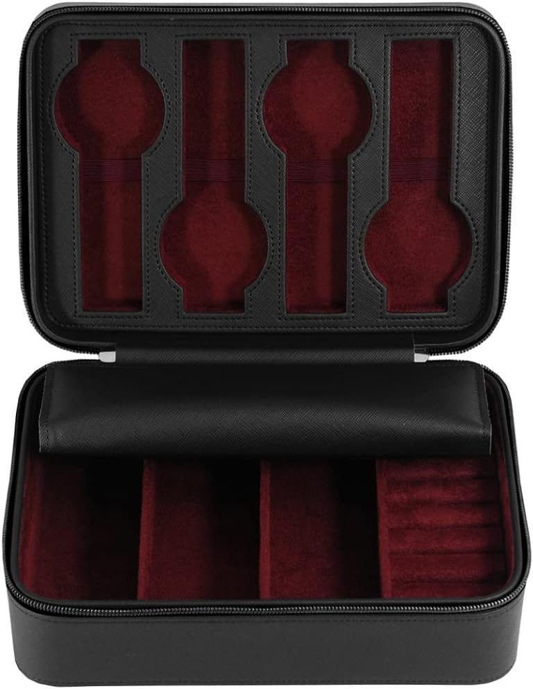 Features 4 watch slots, 3 sunglasses compartments and small padded rows for cufflinks and rings