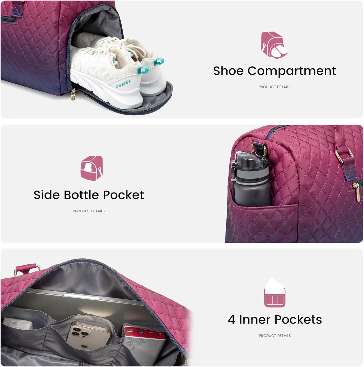🚗DURABLE & WATERPROOF WEEKENDER BAG🚗:This weekend bag for women is made with durable and water-resistant nylon to protect your items with high quality zipper and metal button.The dual handles and adjustable, detachable shoulder straps have comfortable padding, which can reduce the pressure when carrying.