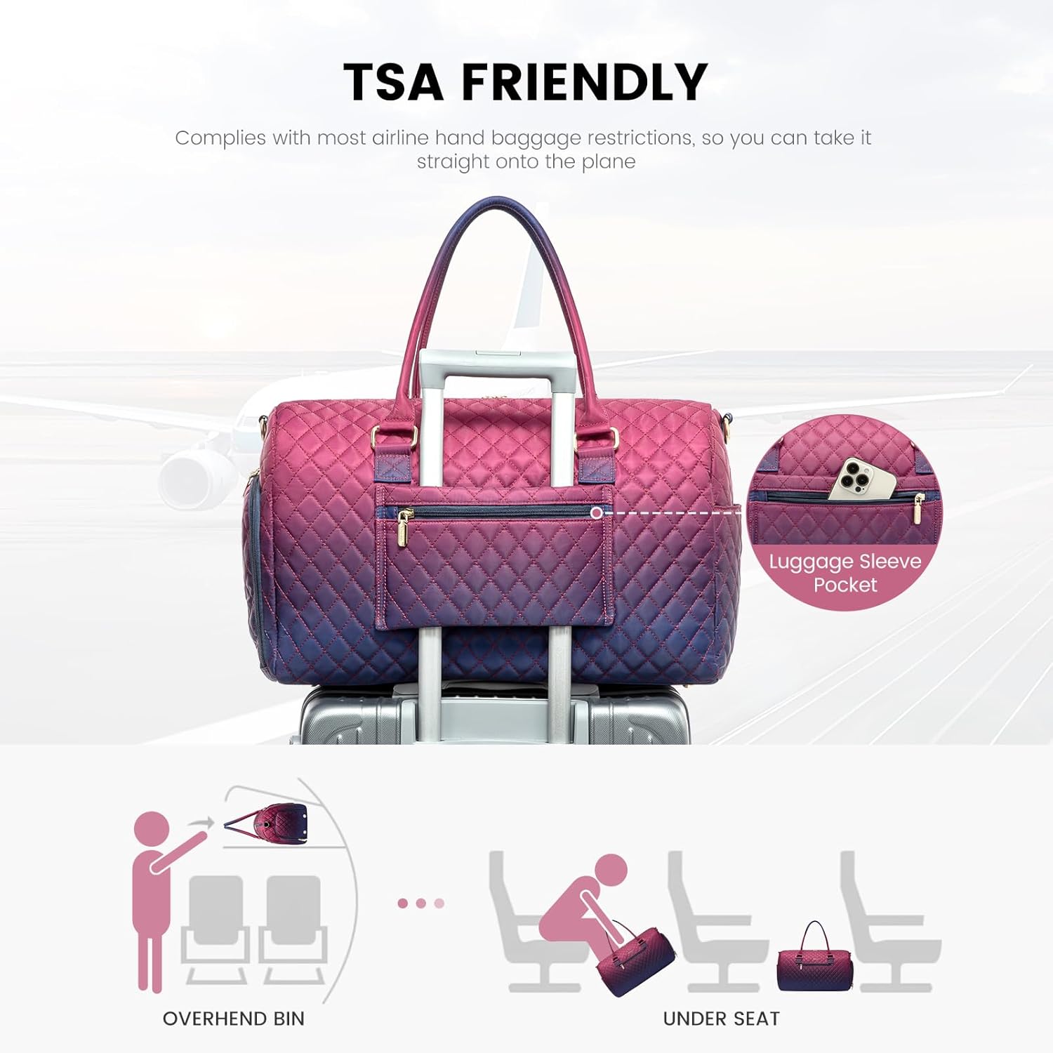 🛫AIRPLANE FRIENDLY CARRY ON BAG WITH SHOE COMPARTMENT🛫:Size: 20x12x8.6 inch,meets most carry-on requirements.This duffel bags for traveling has a separate compartment on the bottom for your shoes and dirty clothes. The integrated trolley cover slides over the rolling luggage handle, making airport travel a breeze.