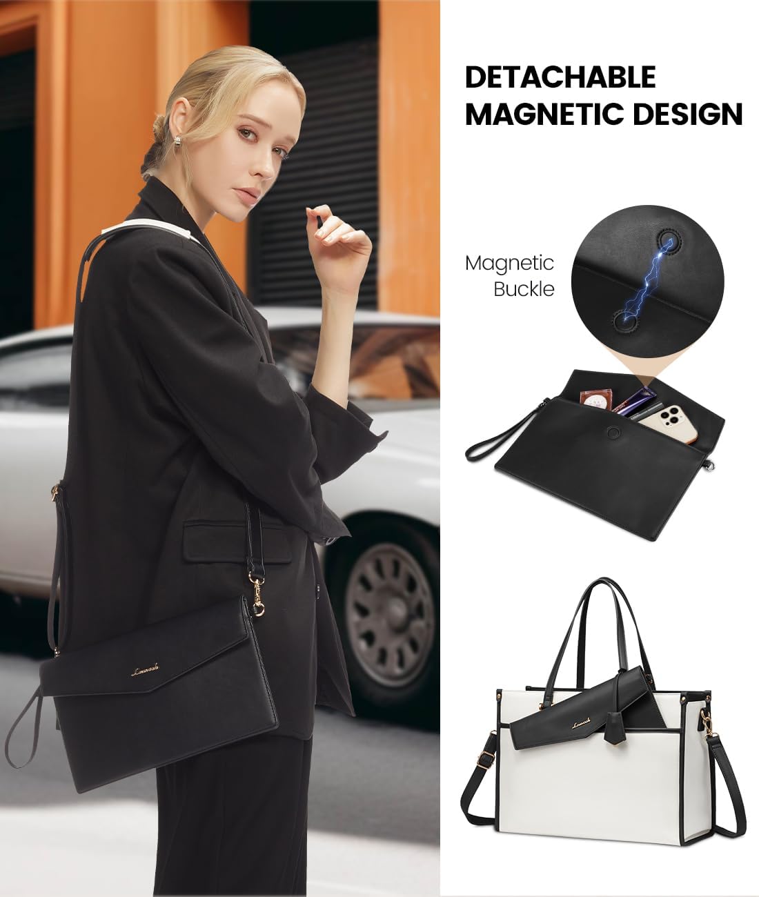 👝Detachable Magnetic Clutch Purse👝: 2-in-1design enhance your work tote bag’s aesthetic with a functional front envelope clutch that doubles as a decorative accessory. The detachable magnetic clutch transitions smoothly from being an integral part of the laptop tote bag for women to a standalone fashionable wallet, clutch, or wristlet, offering convenience and versatility for your day-to-day styling.
