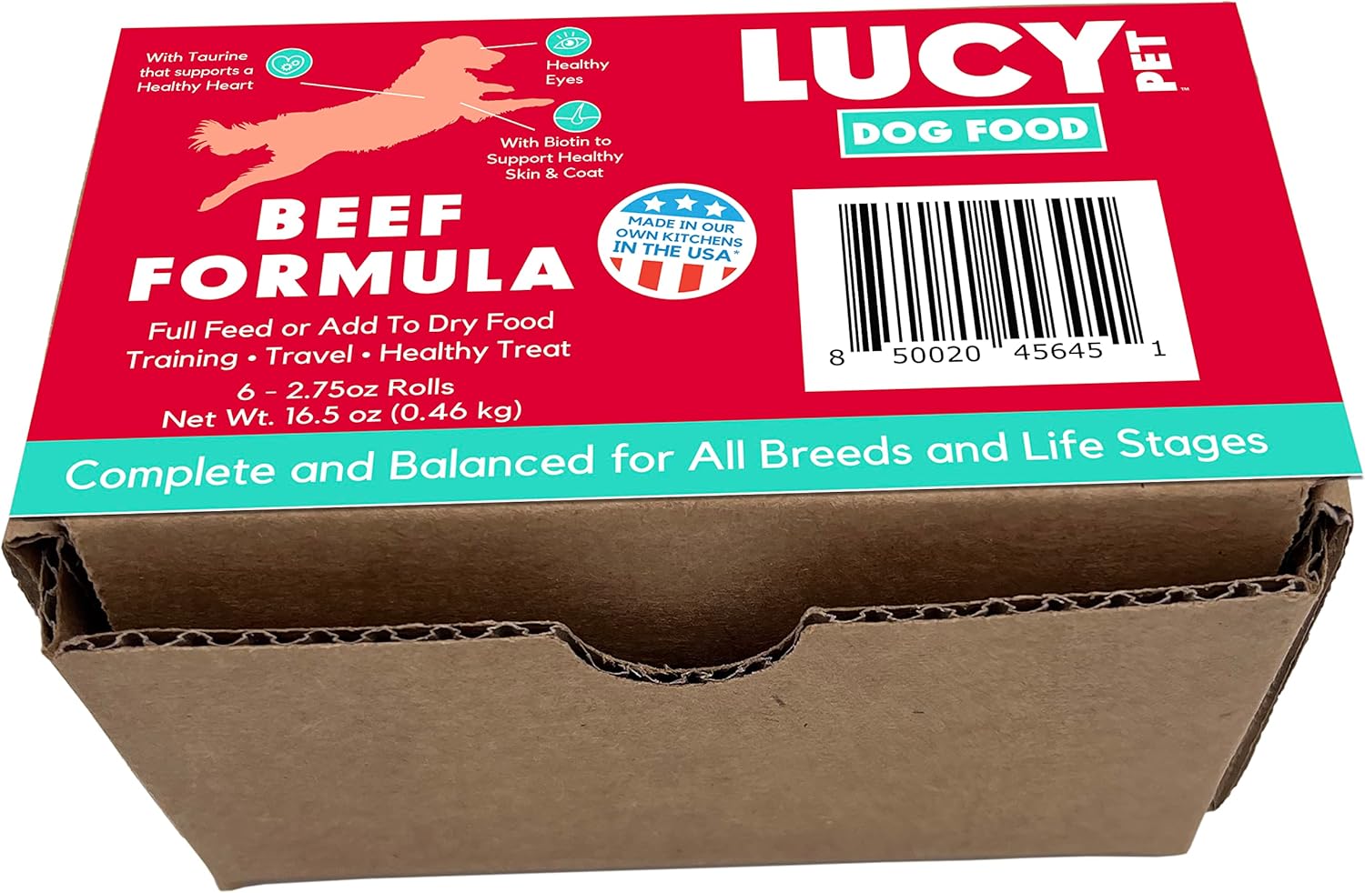 Meaty, semi-moist premium dog food roll loaded with beef that can be used as a full feed, as a treat, or a topper mixed over Lucy Pet dry food. Enticing for the pickiest of eaters with its palatable, meaty texture, and tantalizing aroma. Now in convenient 6 pack!