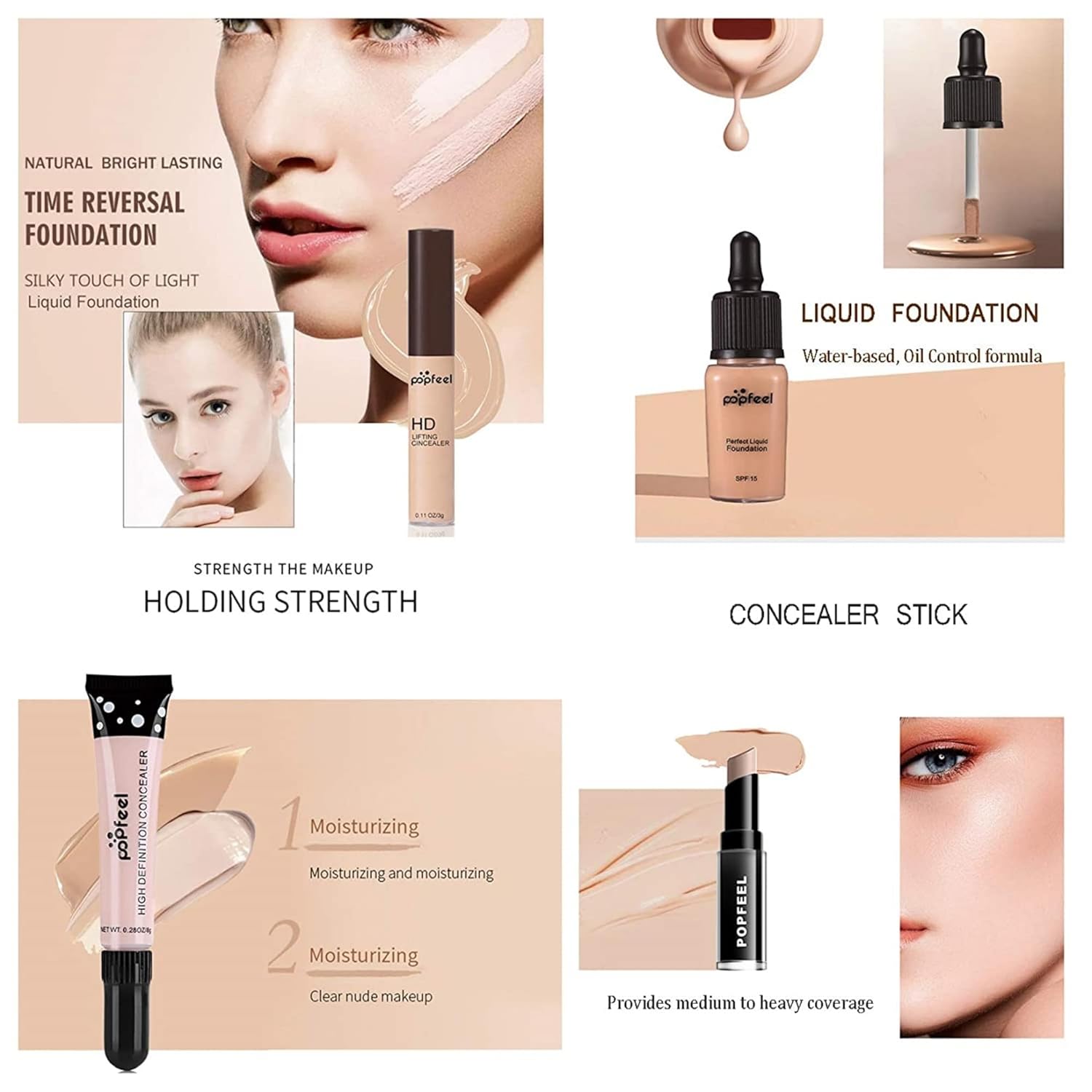2) About face: Primer, Concealer, Concealer stick, Face Makeup, Pressed Powder;