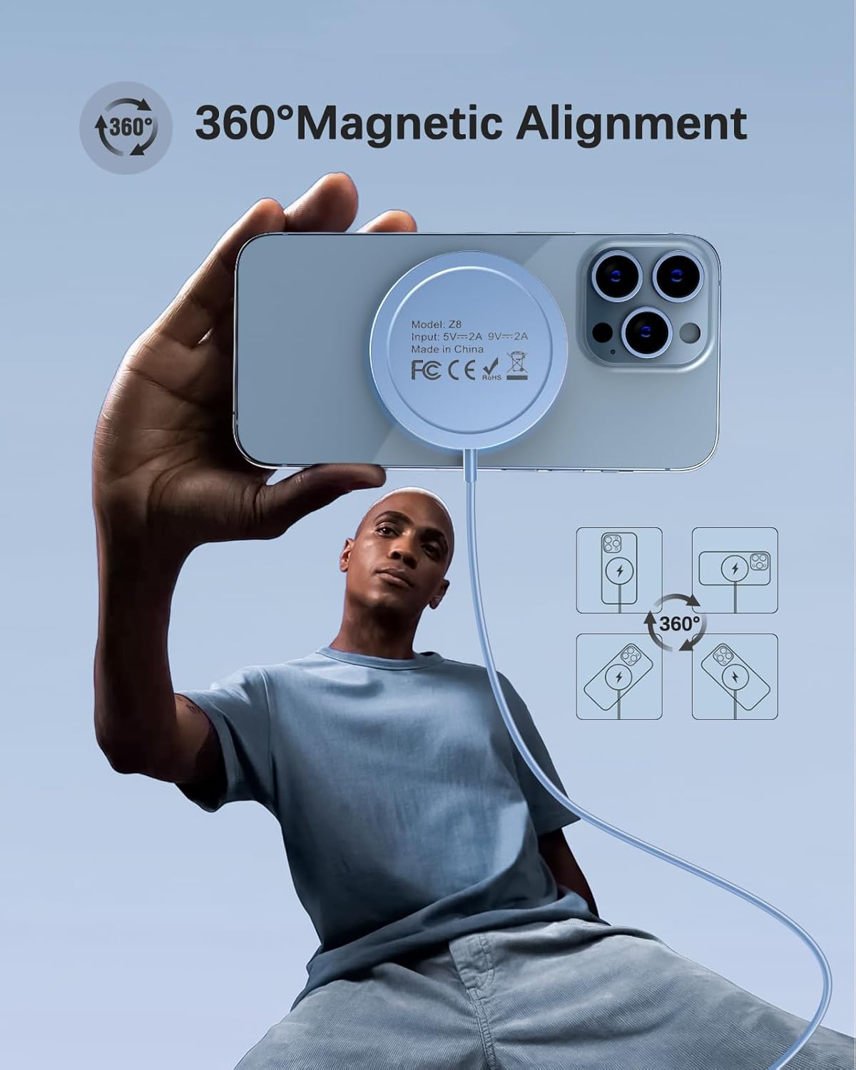 👍【𝗦𝗮𝗳𝗲𝗿 𝗜𝗻𝘁𝗲𝗹𝗹𝗶𝗴𝗲𝗻𝘁 𝗣𝗿𝗼𝘁𝗲𝗰𝘁𝗶𝗼𝗻】This wireless charger pad for iPhone always charges your device safely and securely. When the anti-iPhone appears overcharging, overcurrent, overvoltage, overheating or short circuit, the LED light on the magnetic charger will fast continuous flashing and stop charging.