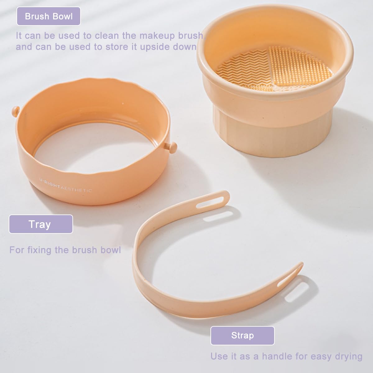 【Easy to Use】(1) Pour cleaning solution water into the brush cleaning bowl (2) Gently scrub the brush on the cleaning pad (3) Insert the brush into the mesh hole at the bottom of the bowl, hang the cleaning bowl to dry the makeup brush