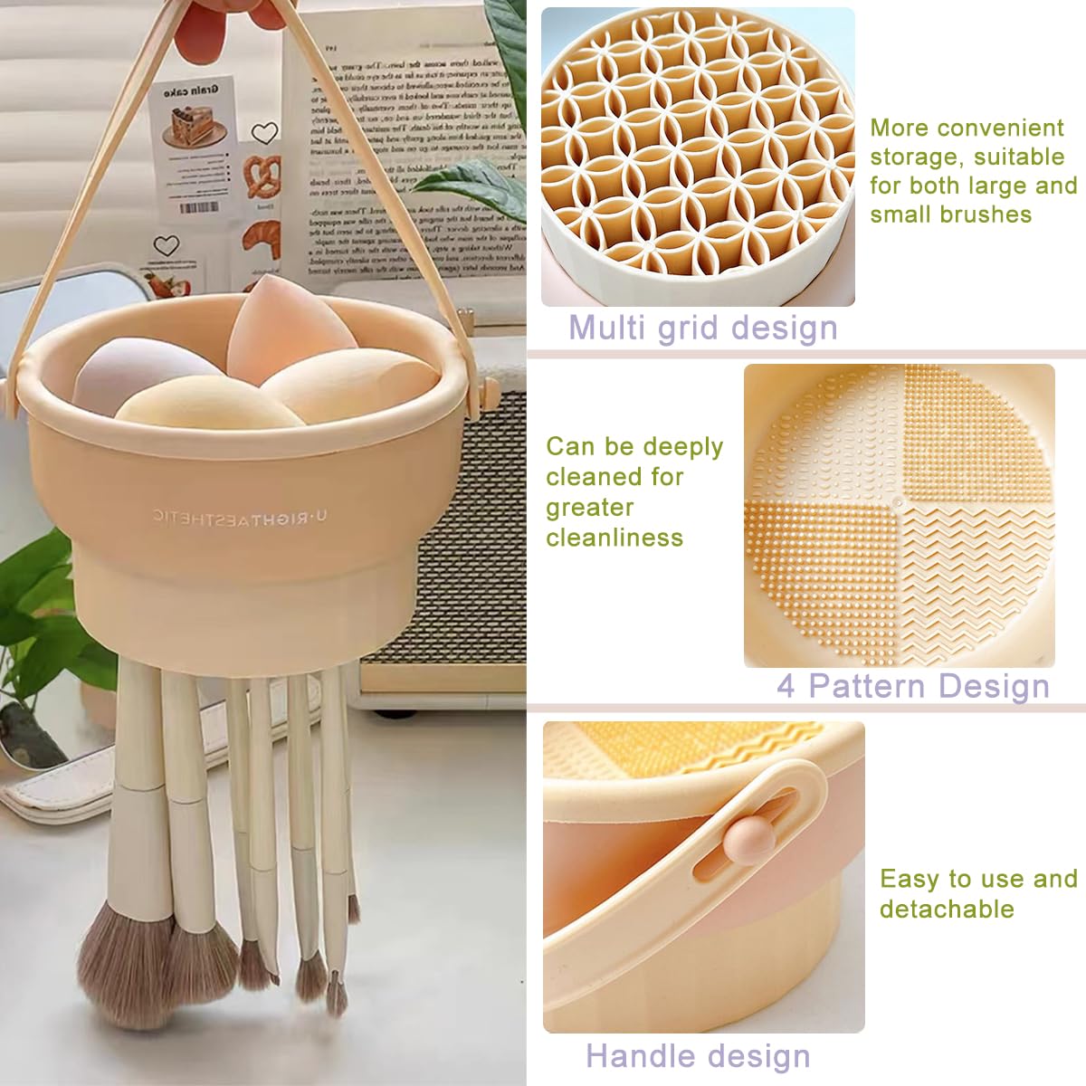 Makeup Brush Cleaner Mat 3 in 1 Silicone Makeup Cleaner Bowl with Makeup Brush Holder Cosmetic Brush Washing Tool for Cosmetic Cleaning, Drying, Storage Brushes, Powder Puffs and Sponges(Beige)