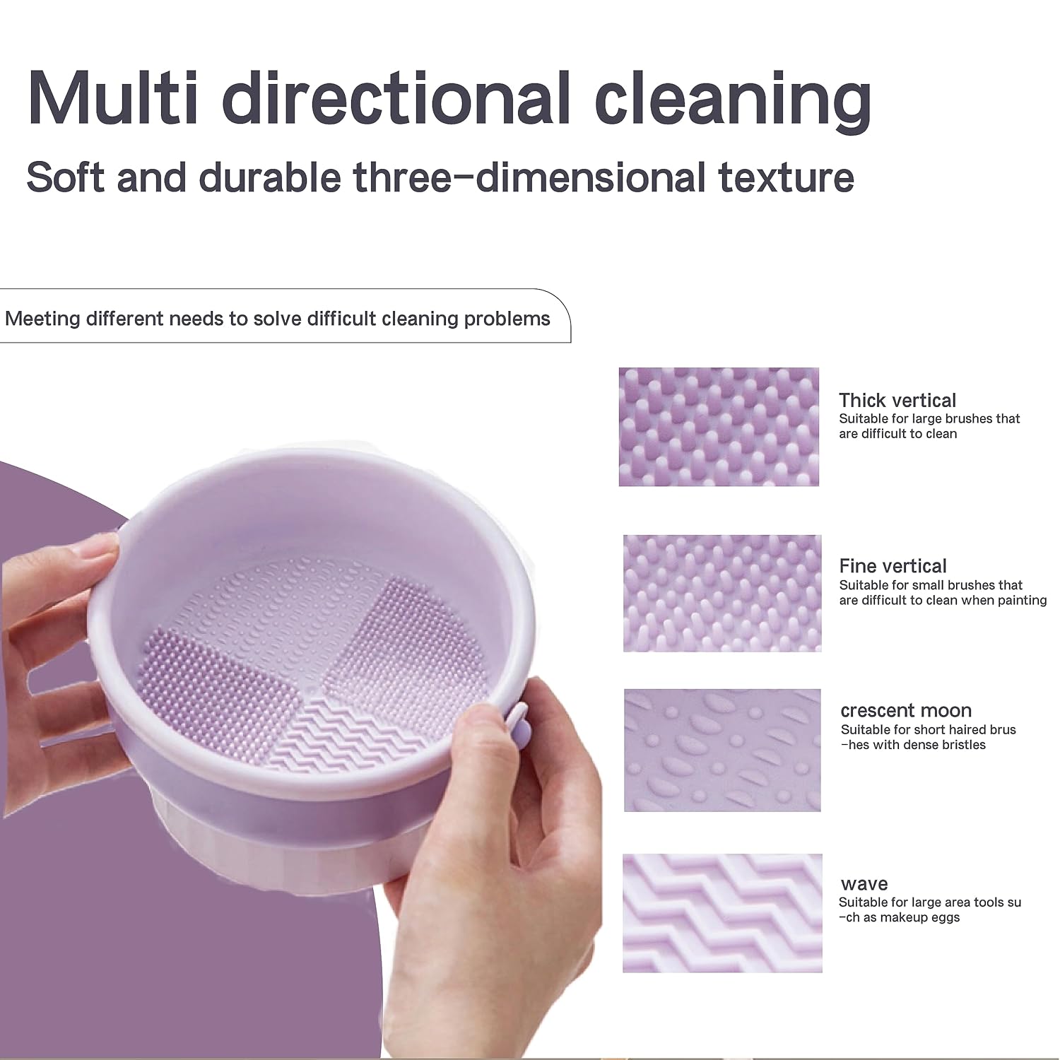 Varied Texture Design: With four professional textures, this tool is designed to thoroughly clean a variety of makeup brushes. The base features purposefully designed holes of varying sizes that allow brushes to naturally air-dry while being stored upside down. Raised edges prevent water from splashing out during the drying process