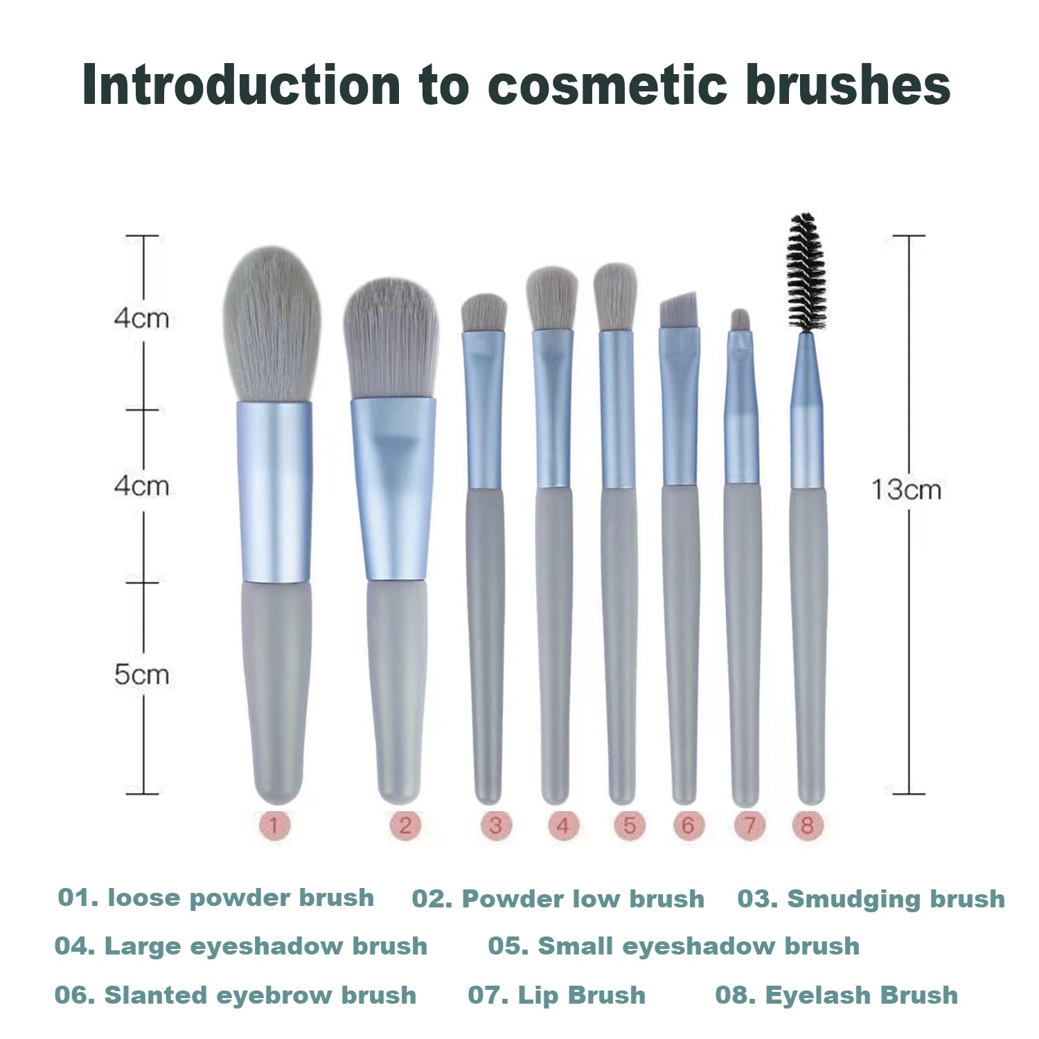 MINI 8 BRUSH SET: Makeup brush set contains 2 large makeup brushes and 6 small precision brushes. Includes foundation brush, eyeshadow brush, lip brush, concealer brush, eyebrow brush, etc. Perfect for travel, business trips.