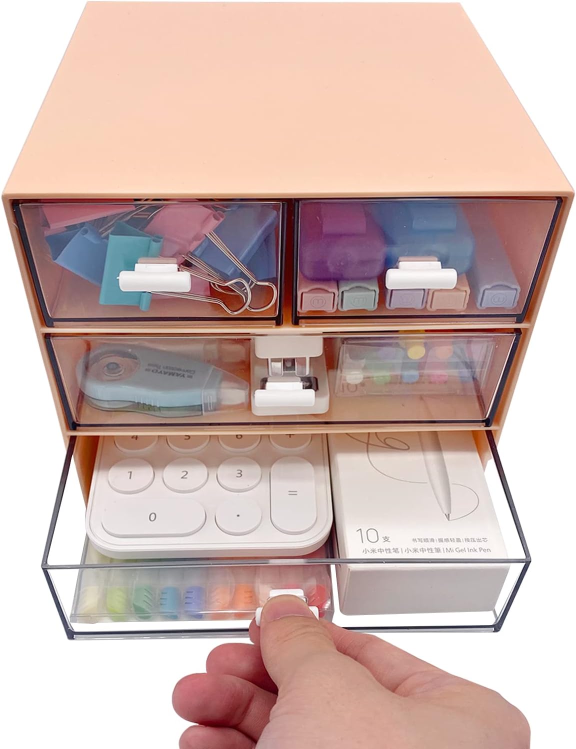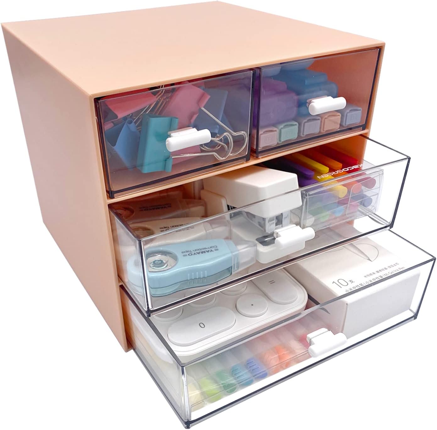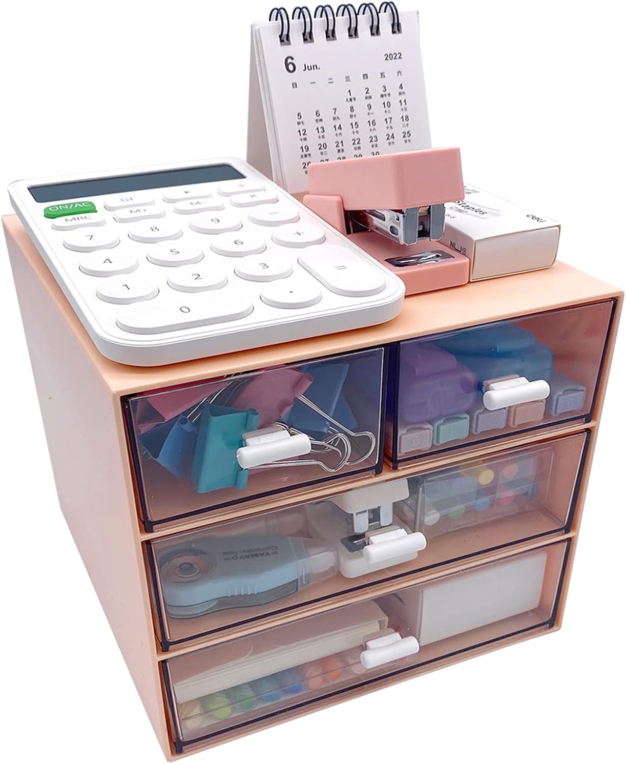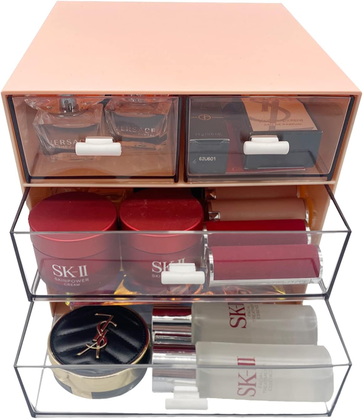 Makeup Organizer, Desk Organizer with 4 Drawers, Sundries Storage, Vanity Organizer, Cosmetic Storage Organizer, Desk Storage Box, Bathroom Counter or Dresser, Pink, (QBH-4CT-3)