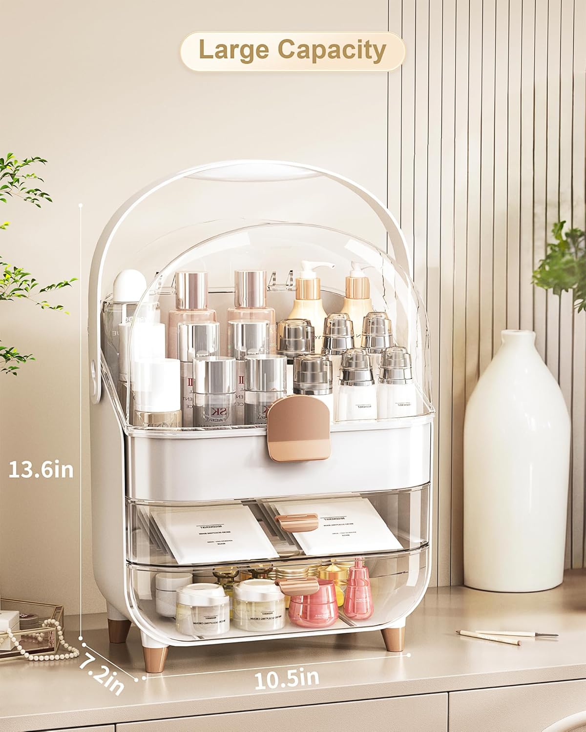 【Reinforced Design & Non-slip】Reinforced and upgraded handle won’t fall off. Easily move the skin care organizer to anywhere. The countertop organizer is made of thickened ABS material, which is stronger and more durable than normal ones. Drawer and clear top are able to open and close easily. Rubberized bottom, non-slip and won’t scratch desktop.