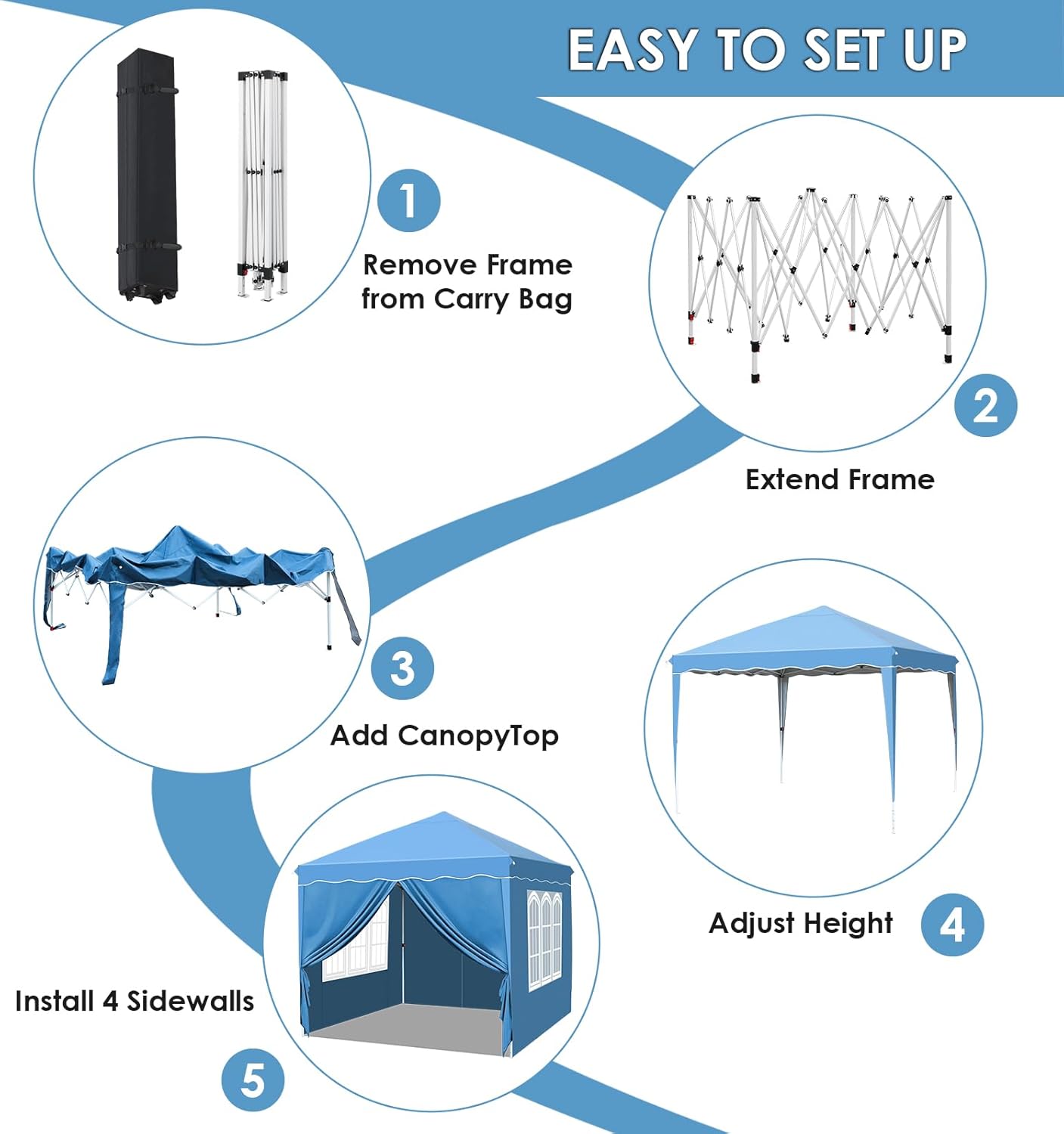【SET UP IN SECONDS】Pop up canopy can be installed in minutes without any tools. 1. Take canopy frame out of wheeled bag and unfold it slightly. 2. Place canopy top fabric on the frame and unfold it completely. 3. Fix the locking mechanism at four corners and adjust the height of tent. 4. Install 4 side walls as needed. Store it in the rolling bag when not in use for easy storage and transportation.