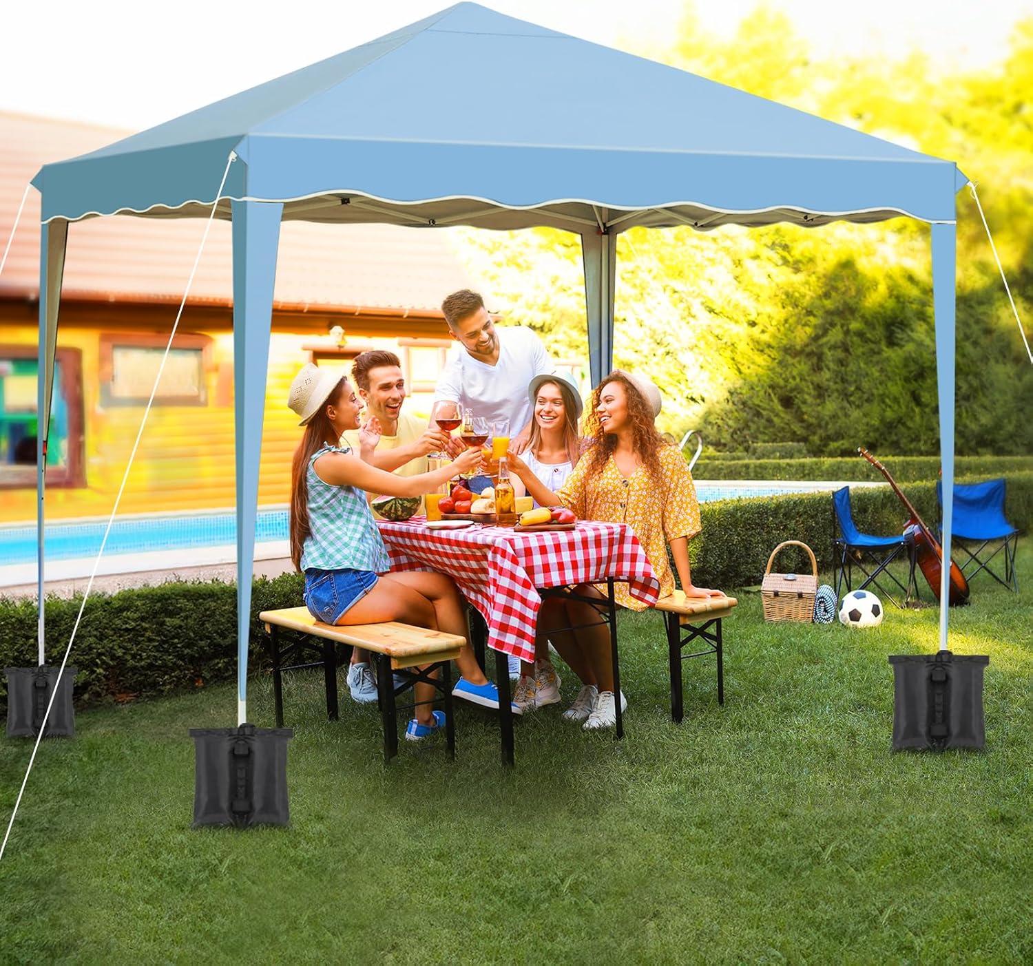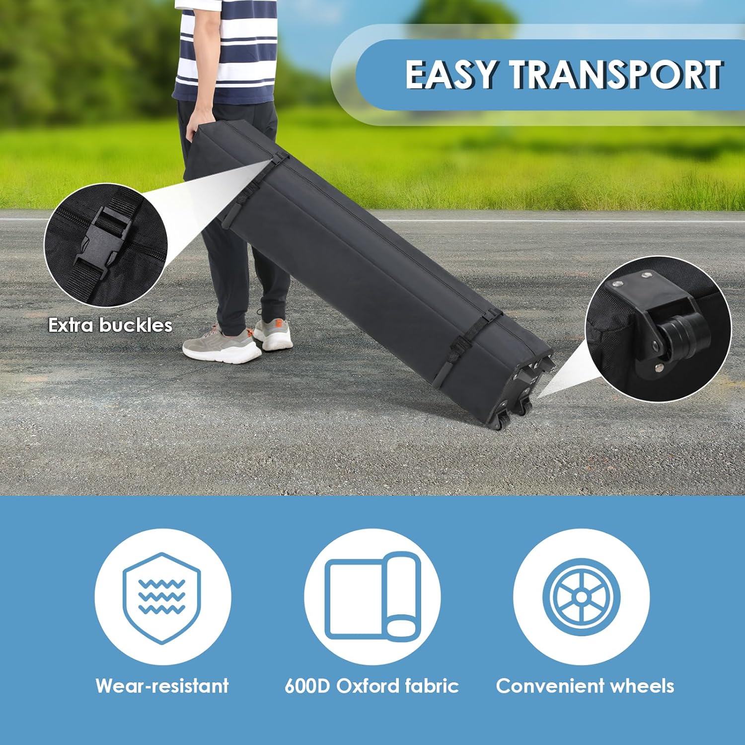 【600D WHEELED BAG】Instant canopy tent comes with a roller bag. 600D Oxford fabric is stronger and more durable. Wheels are designed for easy transport and fit effortlessly into the trunk of your car. Tent comes with 4 windproof ropes and 8 ground nails to firmly fix the tent to ground. There are also 4 sandbags for added stability.