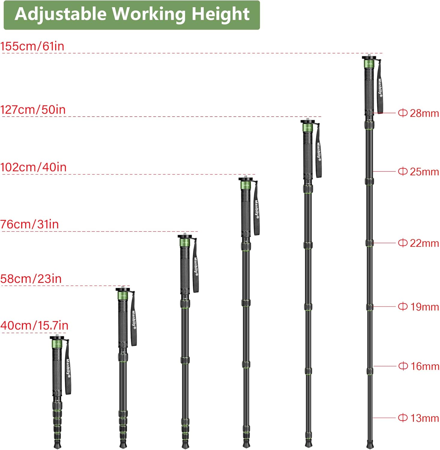This monopod from Manbily is designed in a stylish green color, a rare color combination on the market to show your taste, green represents nature and calm. The very compact design is easy to put in backpacks and luggage, reducing your burden. Installed with the included handle can be used as a walking stick.