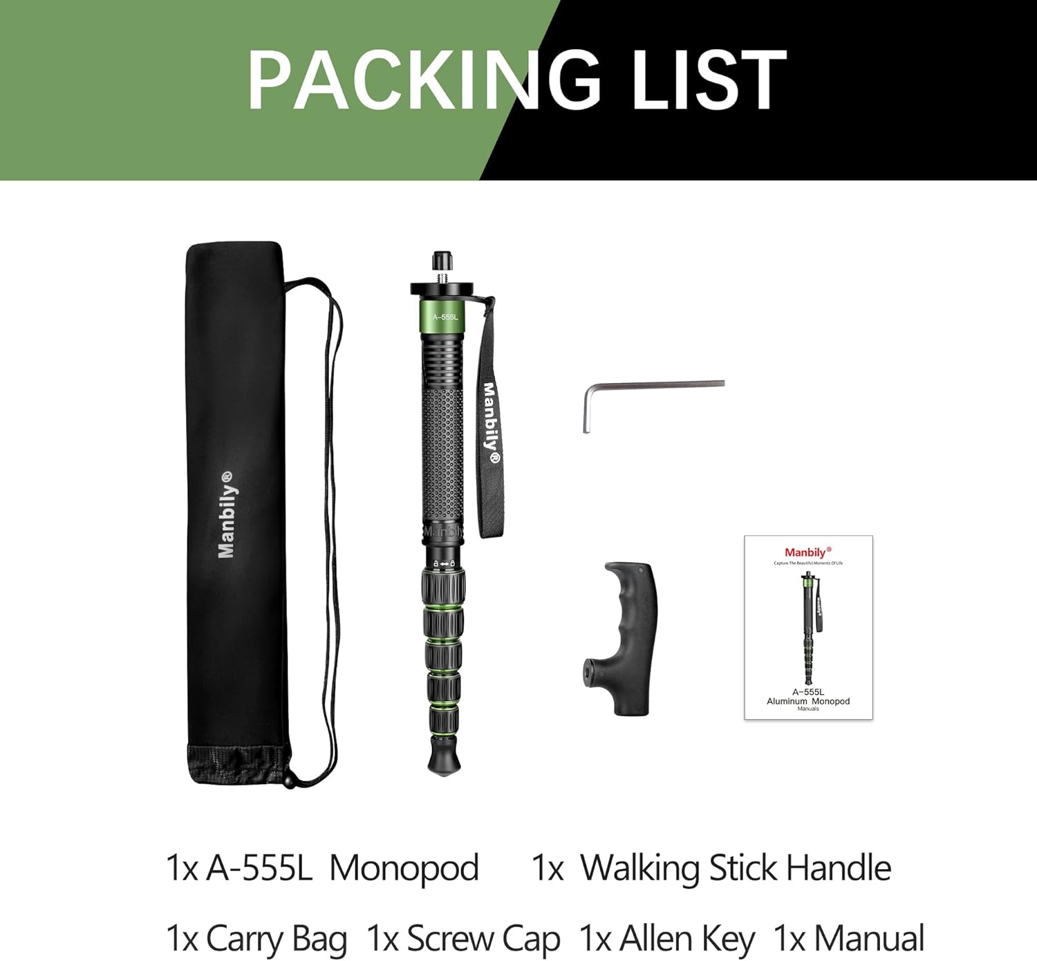 Manbily Camera Monopod Aluminum Portable Compact Lightweight Travel Monopod with Carrying Bag Walking Stick Handle,for DSLR Canon Nikon Sony Video Camcorder (Aluminum, Green&Black)