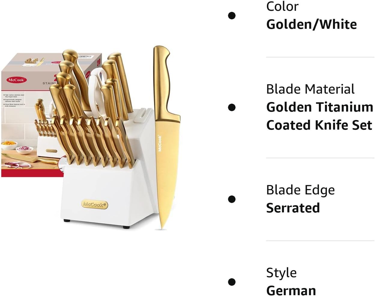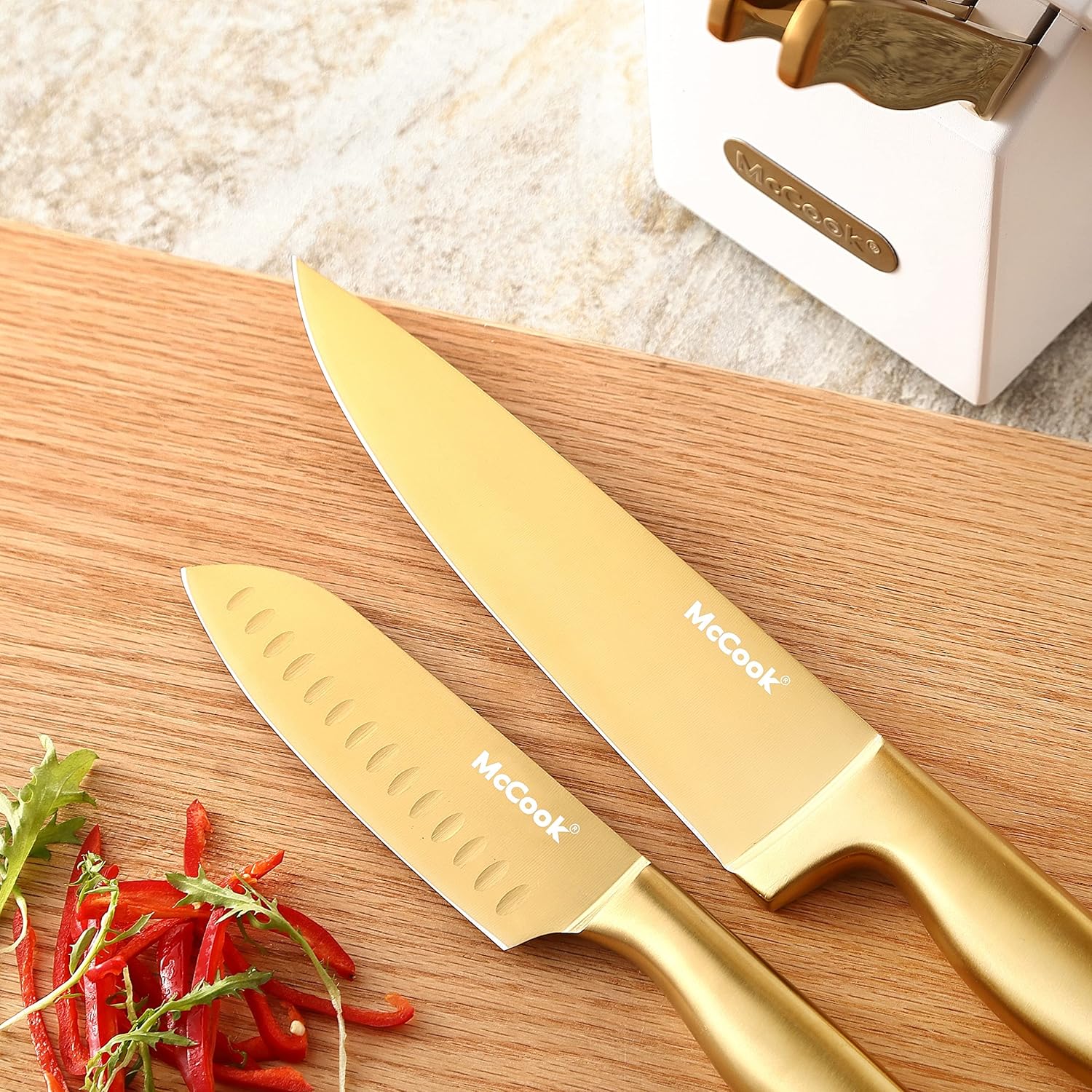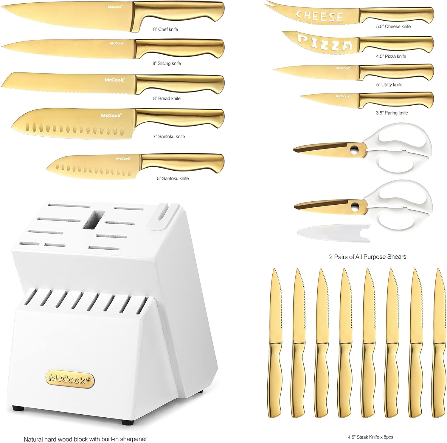 McCook® Kitchen Knife Sets, Golden Titanium Stainless Steel Knives Block Set with Built-in Sharpener