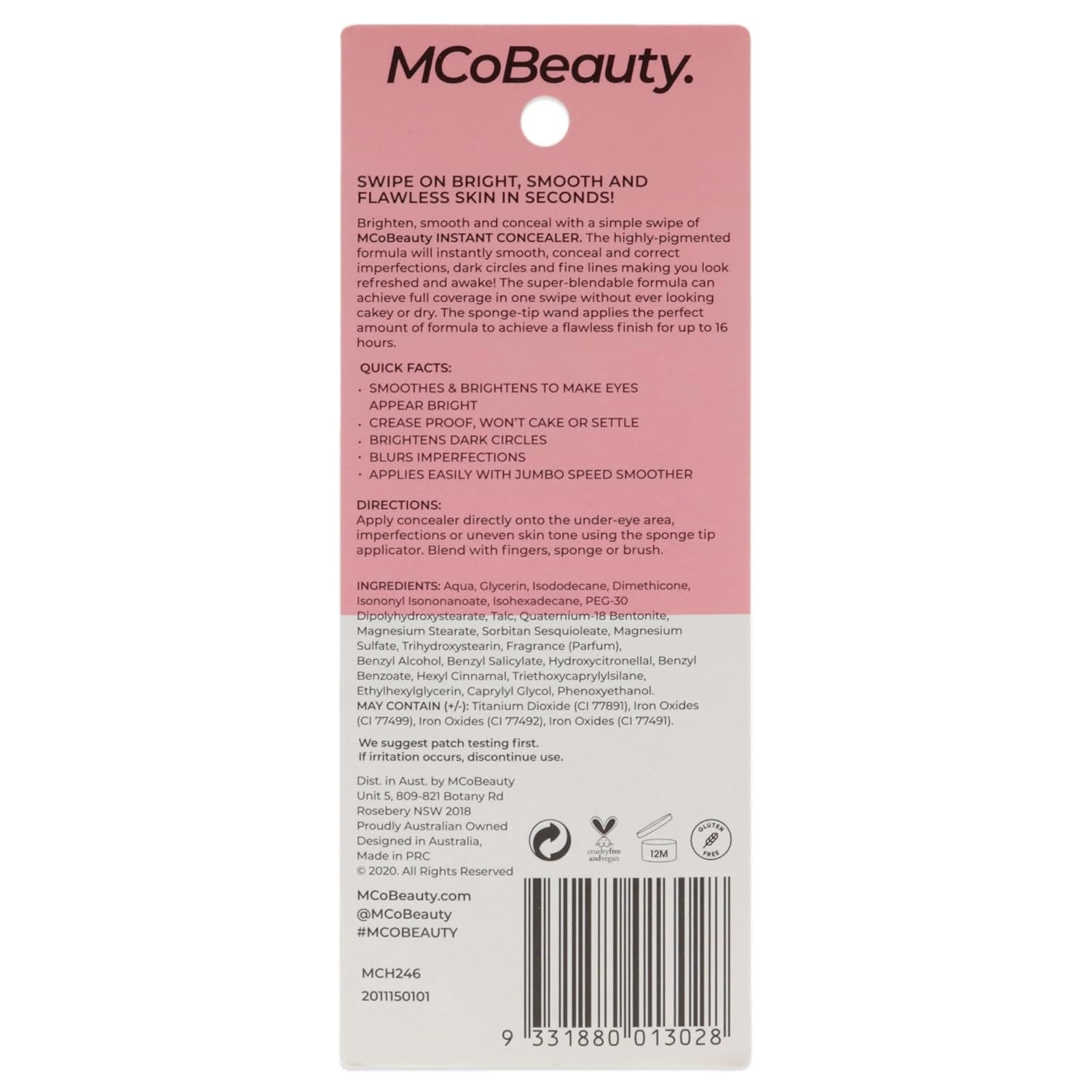 Brighten, smooth and conceal with a simple swipe of MCoBeauty Instant Concealer. The highly-pigmented formula will instantly smooth, conceal and correct imperfections, dark circles and fine lines making you look refreshed and awake! The super-blendable formula can achieve full coverage in one swipe without ever looking cakey or dry. The sponge-tip wand applies the perfect amount of formula to achieve a flawless finish for up to 16 hours.