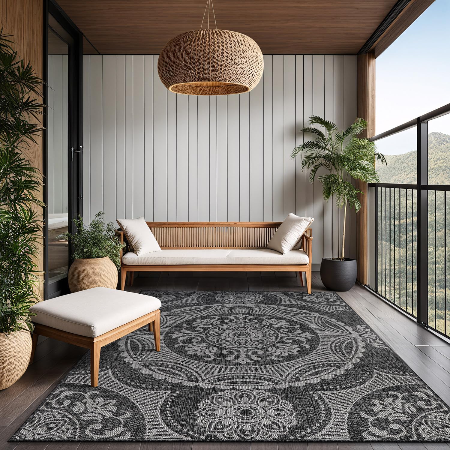 Medallion Outdoor Rug 9×12 Washable Outside Carpet for Indoor Patio Porch Waterproof Easy Cleaning Non Shedding Area Rugs Dark Gray 9 x 12