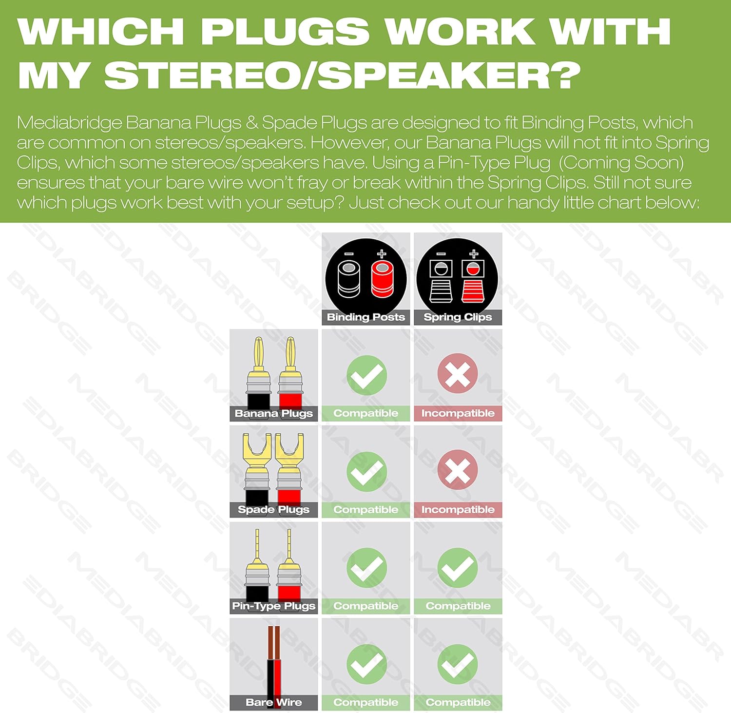 Fits banana plugs, spade tips or bent pin connectors, which are typically compatible with audio components like speakers, A/V receivers, amplifiers & other professional sound applications