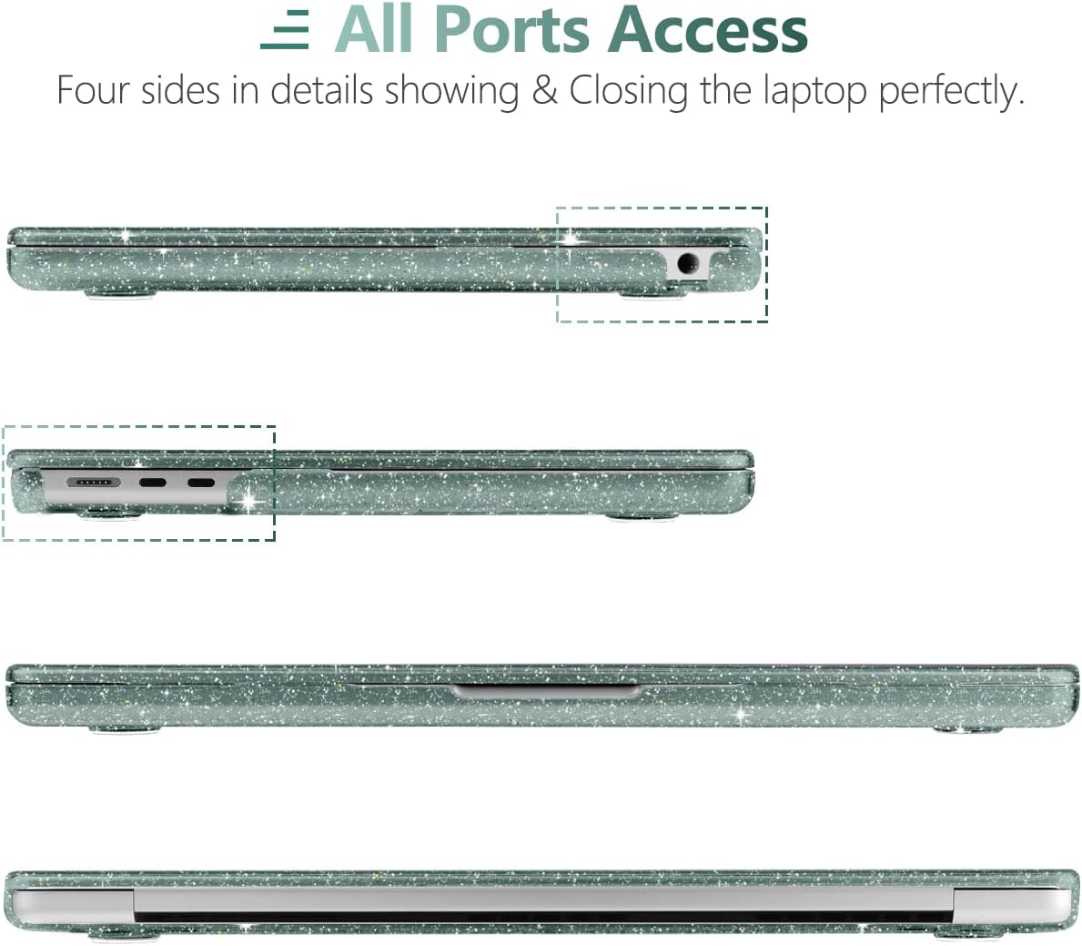 𝙈𝙐𝙇𝙏𝙄𝙁𝙐𝙉𝘾𝙏𝙄𝙊𝙉 – Macbook air 2022 case with bling top cover and bottom shell lightweight to resist scratches and skidding, impact protection. Precise construction allows complete access to all ports, features, buttons and Touch ID function. Simple clip-on/off design without the added risk of harming your laptop during application. Anti-slip with black rubber four stands at the bottom.