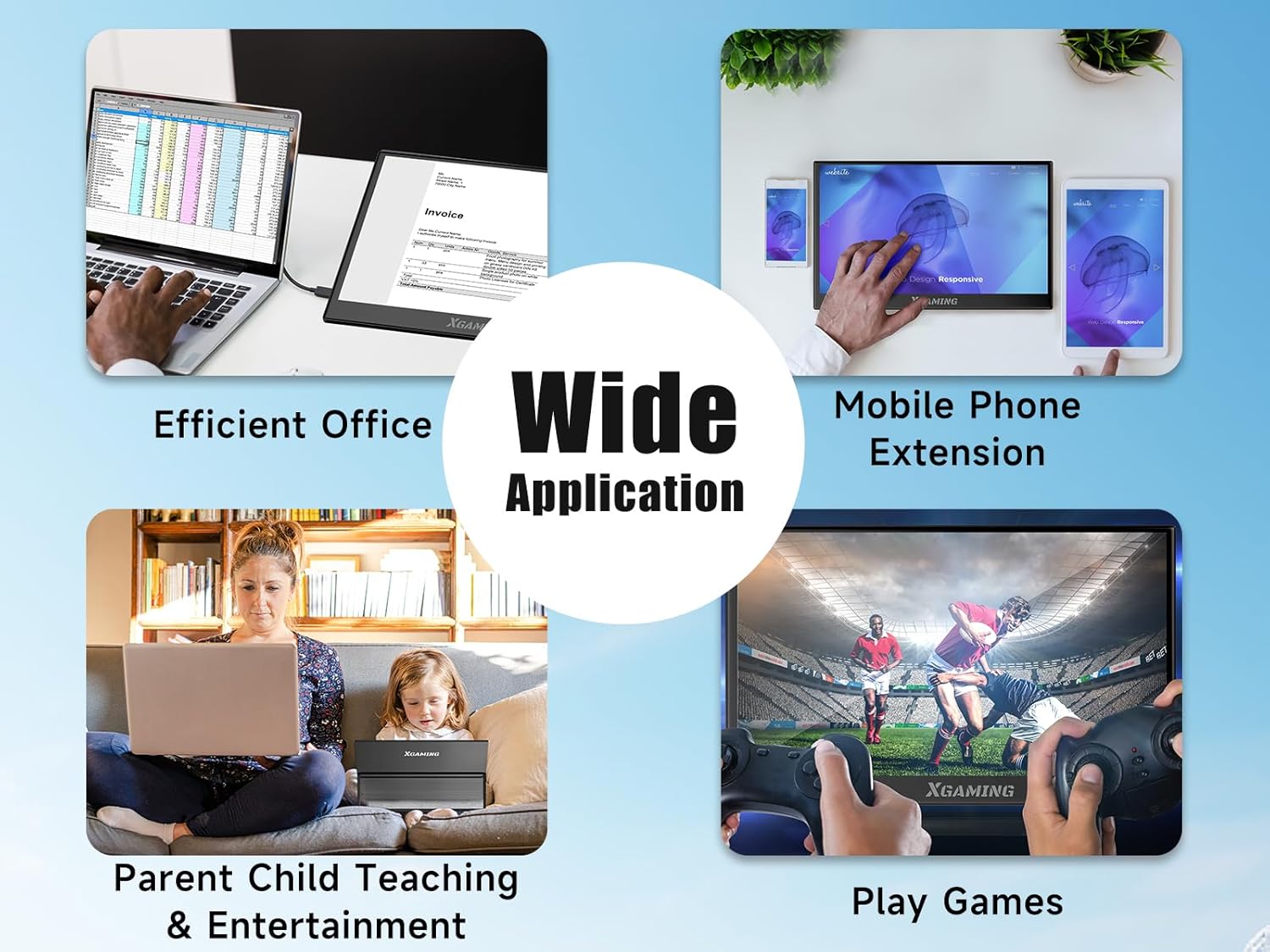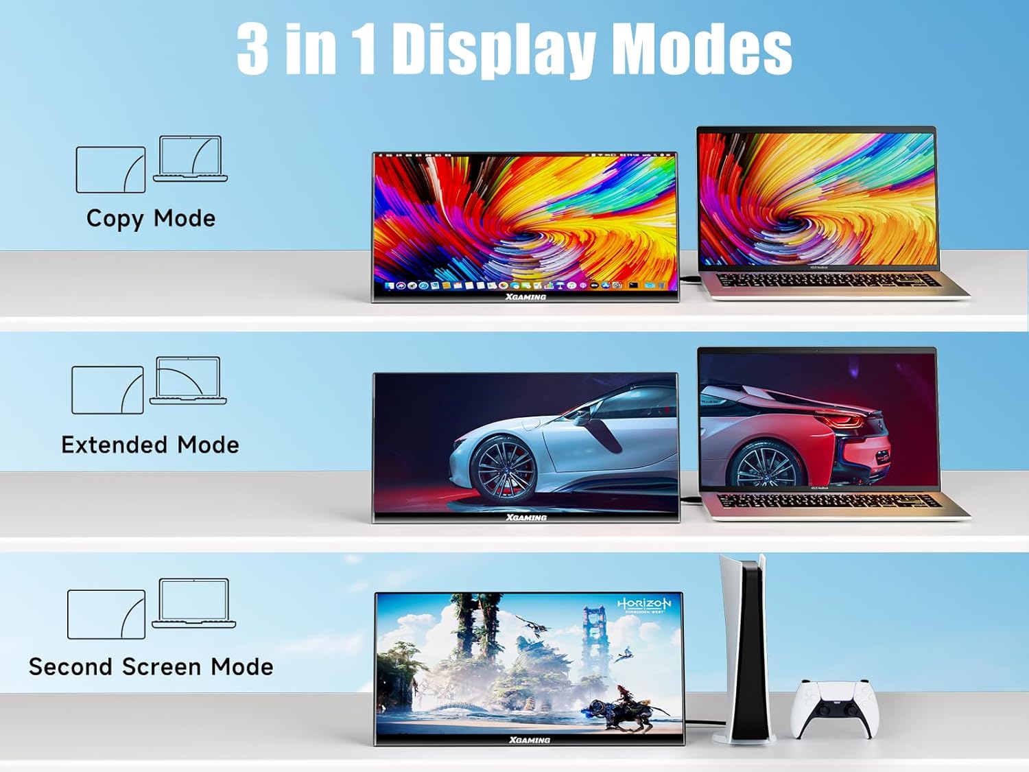 Multiple Display Modes – memzuoix Travel Monitor supports 3 display modes: via laptop settings, easy to adapt to Second Screen Mode, Copy Mode, Extended Mode and other functions. XGaming mini monitor can play games as a second screen, or share the screen in meetings at Copy Mode, or double your work efficiency at Extended Mode and bring you an immersive office entertainment experience.