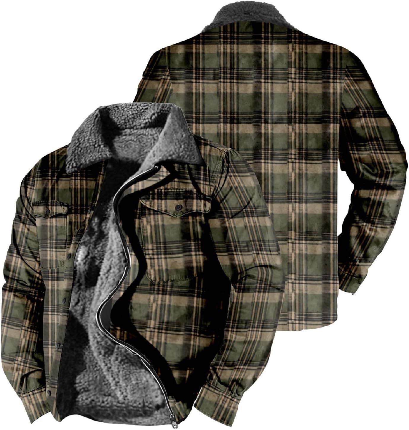 Men’s Fleece Flannel Jackets Print Hooded Zipper Pocket Long Sleeve Shirt Patchwork Jacket Loose Casual Thickened