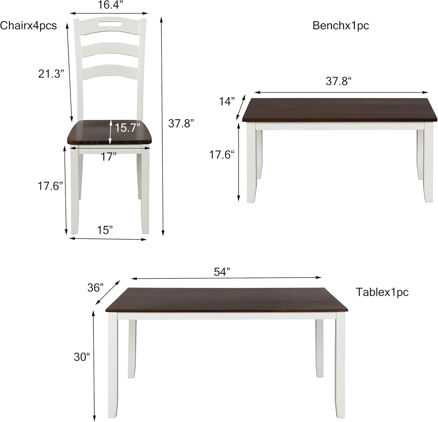 6 Piece Dining Table Set Dimensions: Table: 54″L x 36″W x 30″H; Chair: 15″L x 15.7″W x 37.8″H; Bench: 37.8″L x 14″W x 17.6″H; Table weight capacity: 250 lbs; Single chair weight capacity: 210 lbs; Bench weight capacity: 250 lbs