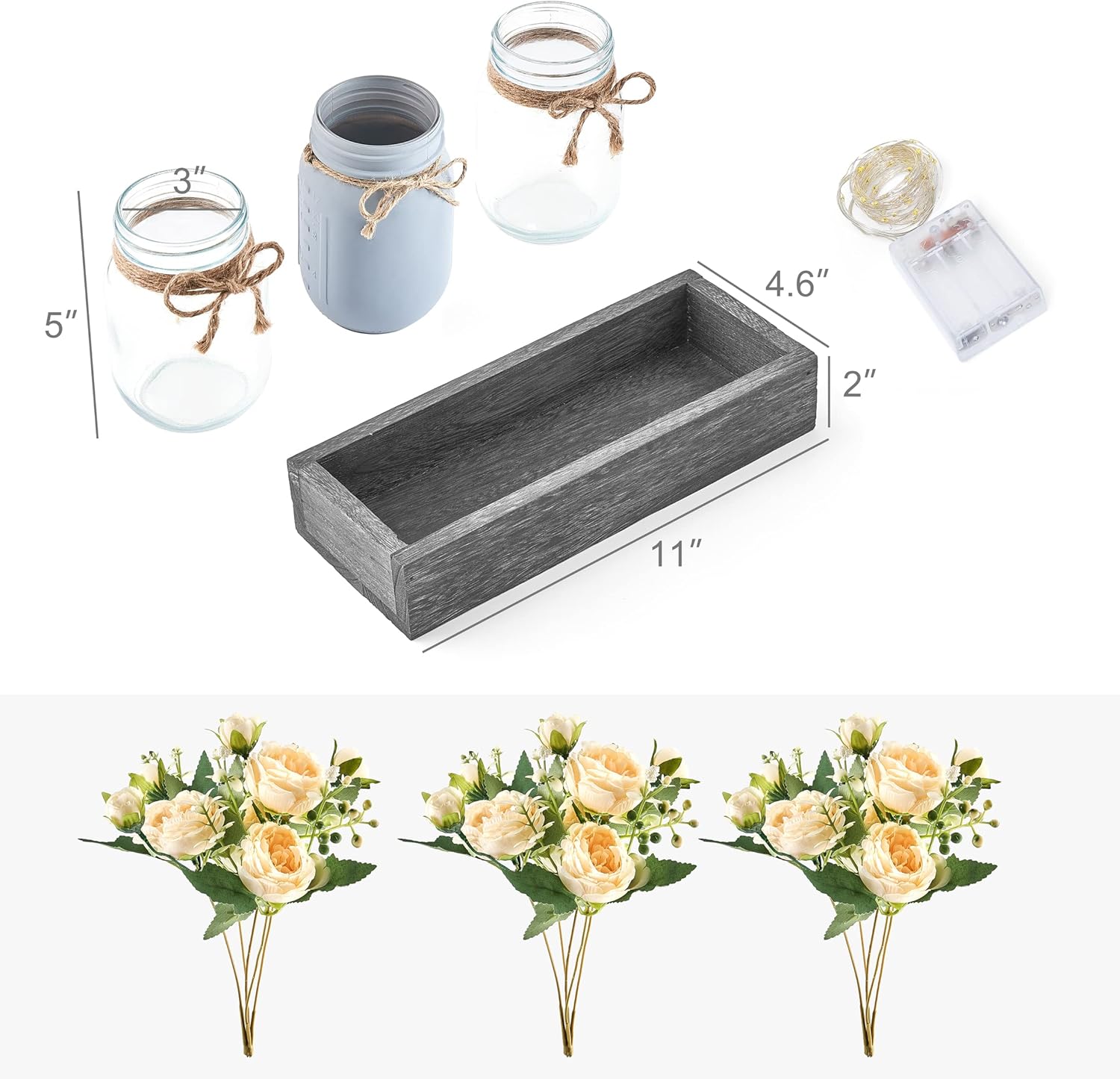Mkono Mason Jar Lights Centerpiece Table Decorations for Dining Room Farmhouse Coffee Table Decor Tray with 3 Jars Flowers Christmas Centerpieces Decor for Kitchen Living Dining Room, Grey Blue