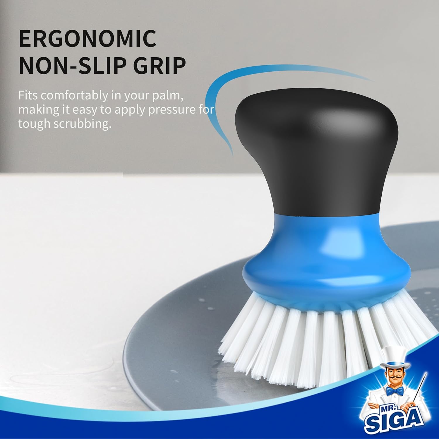 MR.SIGA dish scrub brush is a versatile kitchen scrubber brush designed to simplify dishwashing tasks. It features a palm brush with an ergonomic grip and available in four vibrant colors for you to choose from: gray, green, blue, and orange.