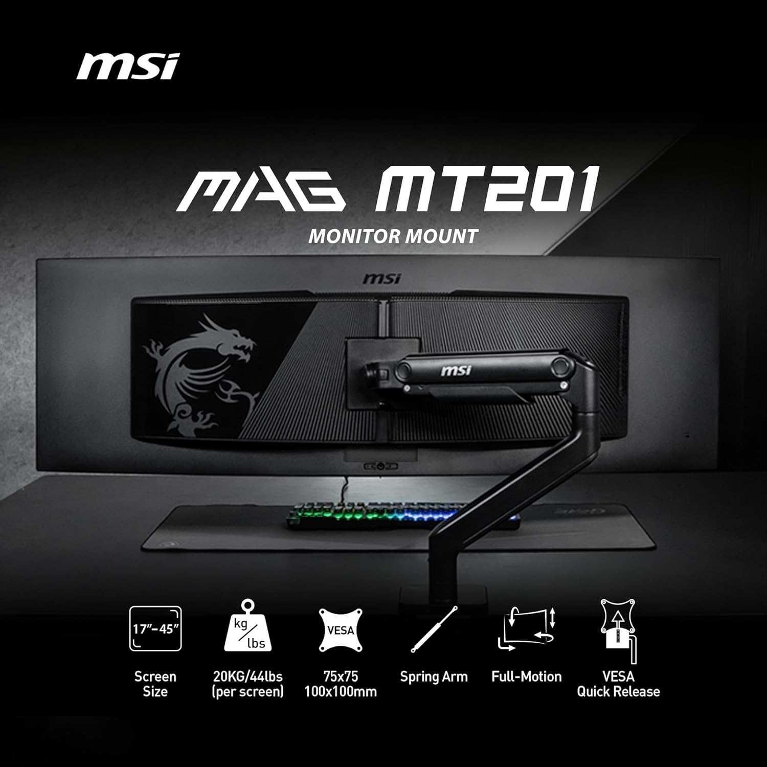 MSI MAG MT201 – Premium Heavy Duty Single Monitor Stand Arm, Supports 17-49″ Screens and 44 lbs, VESA Compatible, Adjustable Spring Assisted Mount, Clamp & Grommet, Quick Release Plate – Black