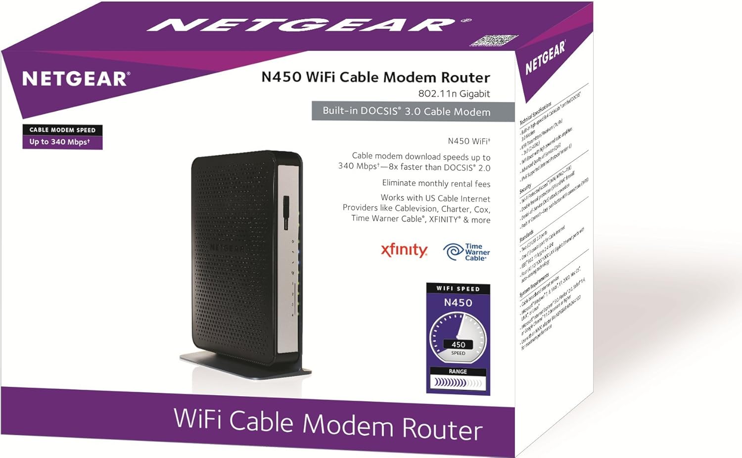 The NETGEAR N450 WiFi Cable Modem Router with 802.11n Gigabit provides a high-speed cable Internet connection. With DOCSIS 3.0 support, the N450 is 8 times faster than DOCSIS 2.0. Four Gigabit Ethernet ports with N450 WiFi make it ideal for HD video streaming and online gaming.