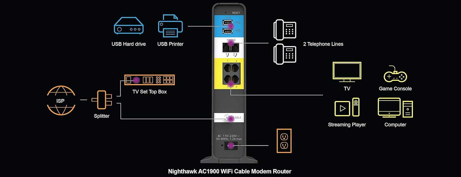The NETGEAR Nighthawk AC1900 WiFi cable modem router for Xfinity internet provides fast combined 1900Mbps wifi speeds, 24 downstream & 8 upstream channels and is ideal for Xfinity internet and voice services.