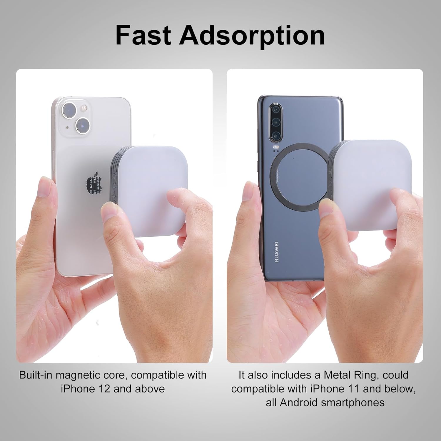 【Magnetic LED Phone Light】Unlike most phone lights on the market, this magnetic selfie light can be installed and fixed by magnetic suction. It can be directly attached to the back of the bare iPhone 12/13/14/15 series. For all Android phones, iPhone 11 and under series, it also can be easily attached to using the included metal ring. Equipped with a high-strength N52 magnet, it can be quickly locked to your phone, and offer a secure and reliable attachment, preventing accidental slip or drop.