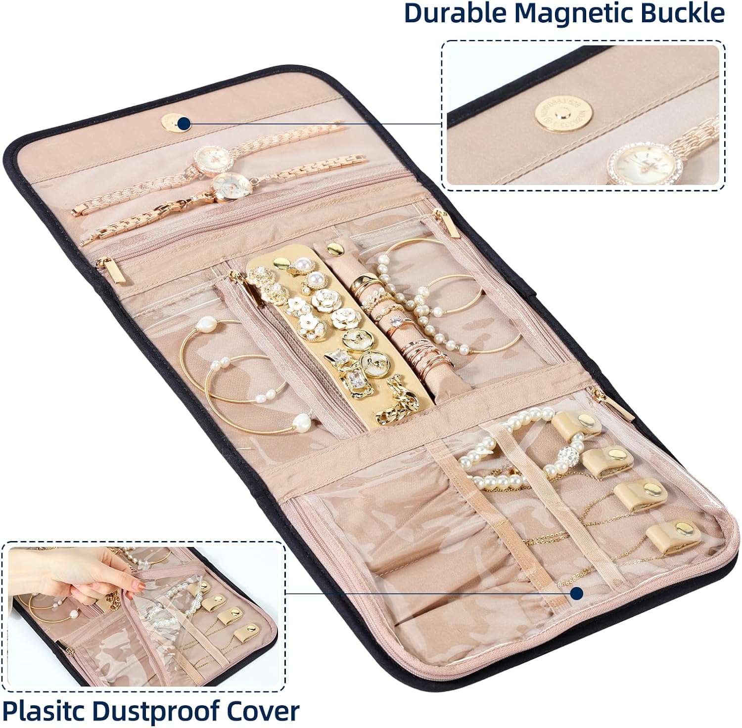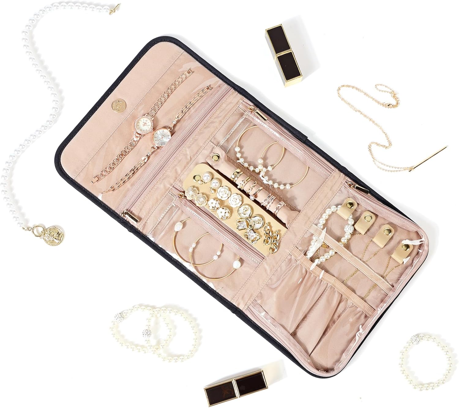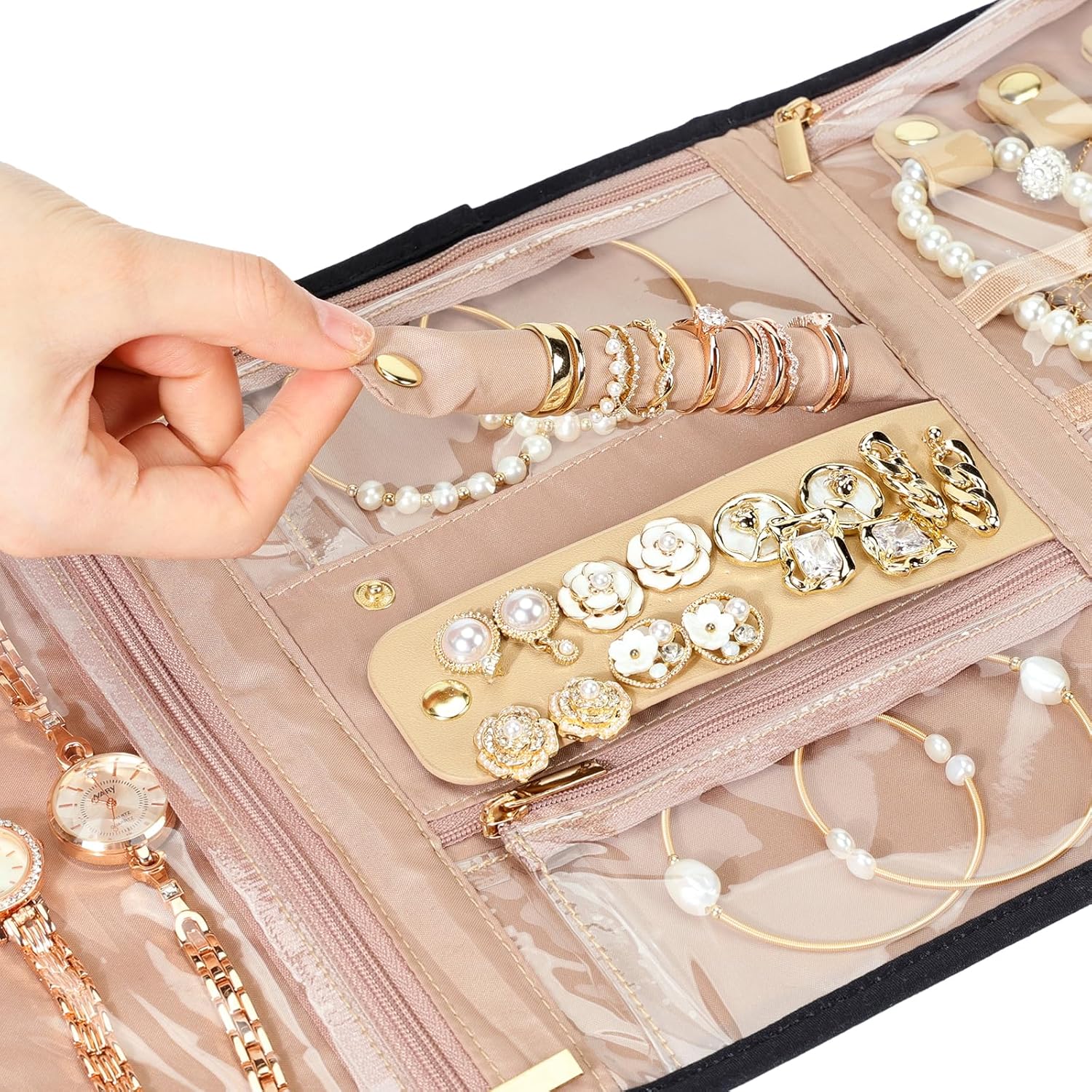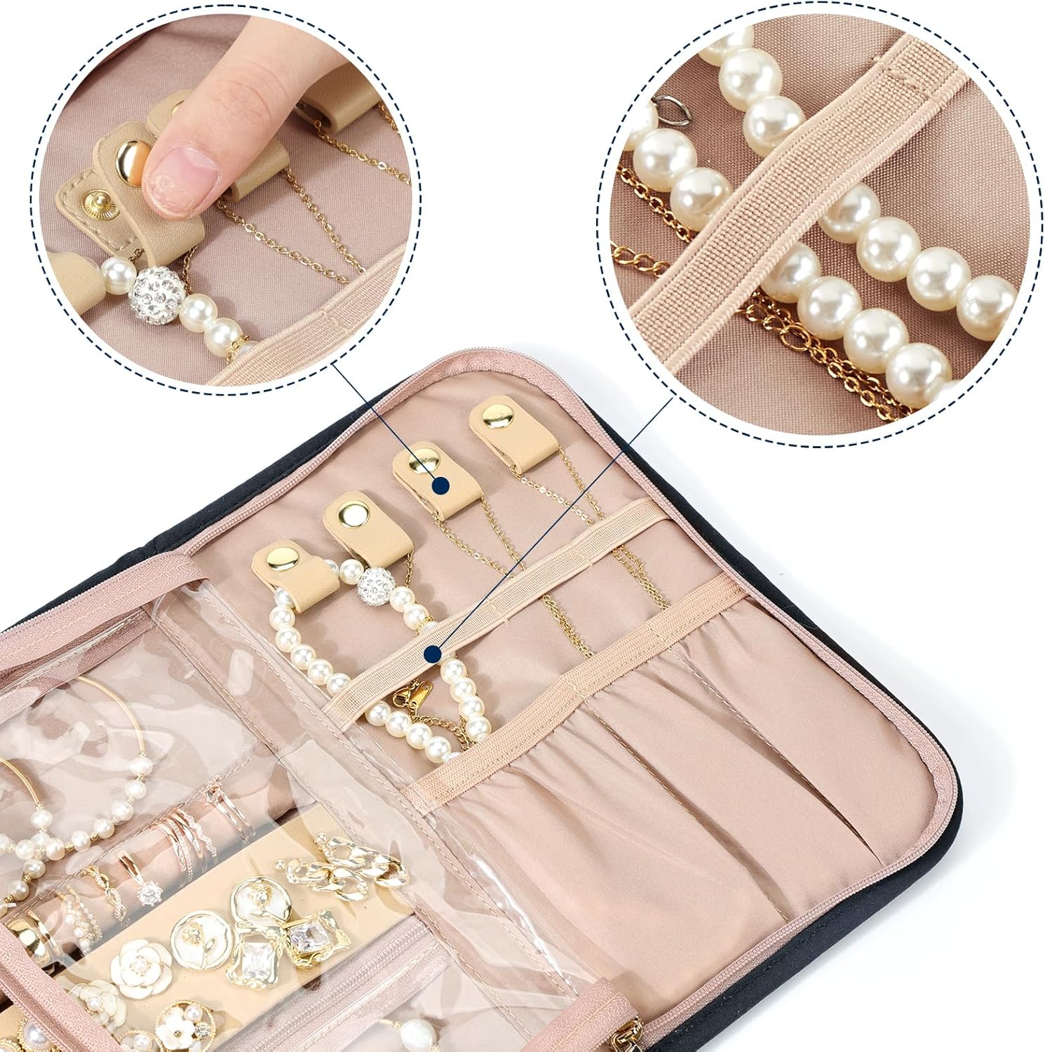 NISHEL Travel Jewelry Organizer Roll, Transparent Foldable Case for Necklaces, Earrings, Rings, Bracelets, Watch, Black