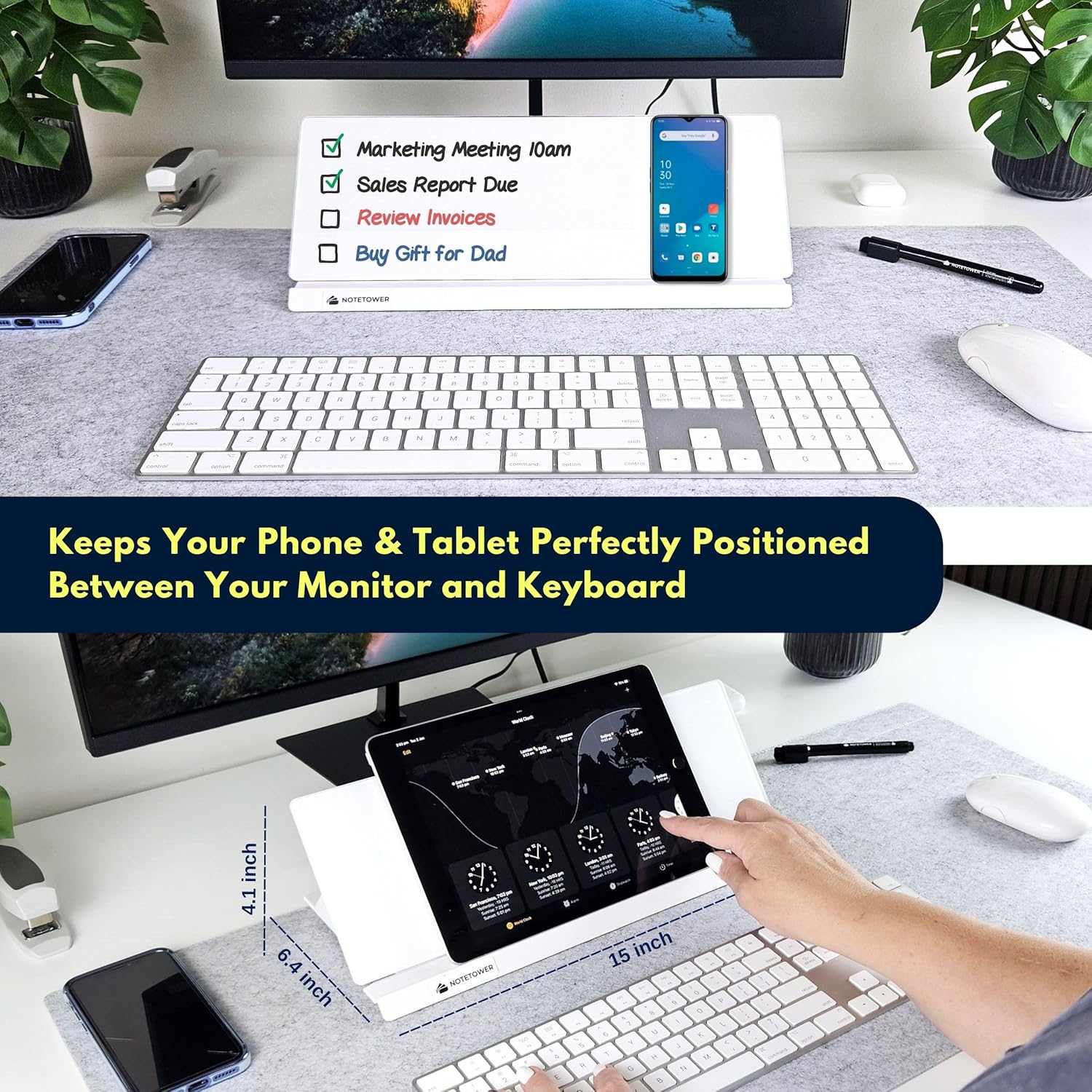 Space Saving Phone & Tablet Stand – Designed to sit perfectly between a keyboard and monitor, the angled glass provides a comfortable viewing angle for phones and tablets. Keep your tech at your fingertips and create a streamlined workspace.