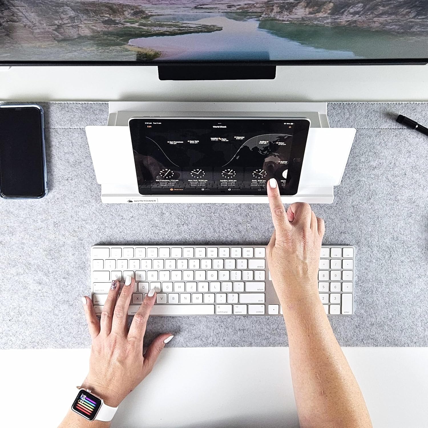 Space Saving Phone & Tablet Stand – Designed to sit perfectly between a keyboard and monitor, the angled glass provides a comfortable viewing angle for phones and tablets. Keep your tech at your fingertips and create a streamlined workspace.