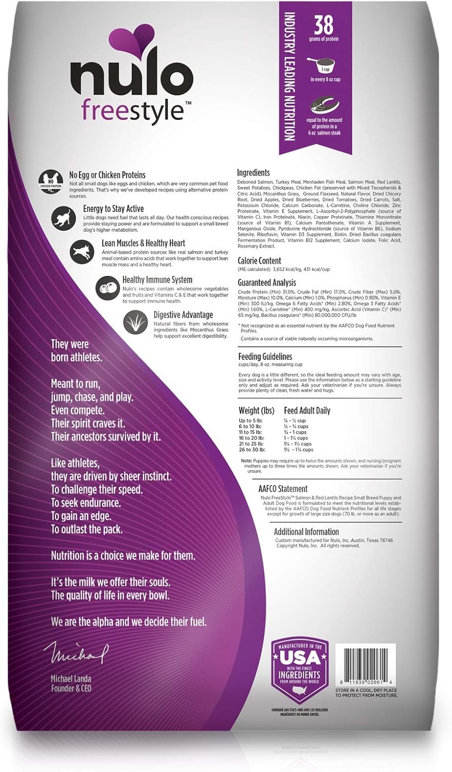 “Nulo FreeStyle Puppy & Adult Small Breed Salmon & Red Lentils Small Breed recipe is formulated to support a small breed dog’s higher metabolism. With 84% of protein coming from real meat like salmon, turkey, and lamb, your small dog is sure to get the nutrition he or she deserves. Made in an extra small kibble size designed to deliver a taste and texture that your small dog will love. Smaller kibble size to promote proper chewing 84% animal-based protein to support lean muscles and healthy heart L-carnitine & miscanthus grass promote healthy weight Probiotic supports digestive and immune health No corn, wheat, soy, or artificial preservatives, colors or flavors”