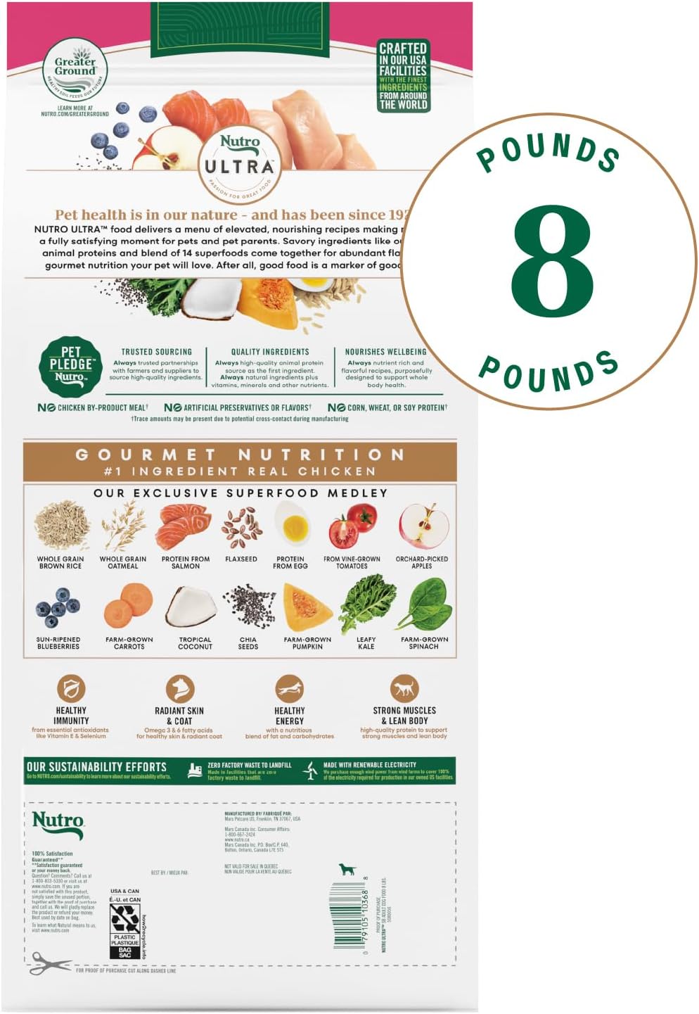 Contains one (1) 8 lb. bag of NUTRO ULTRA Small Breed Adult Dry Dog Food with a Trio of Proteins From Chicken, Lamb and Salmon