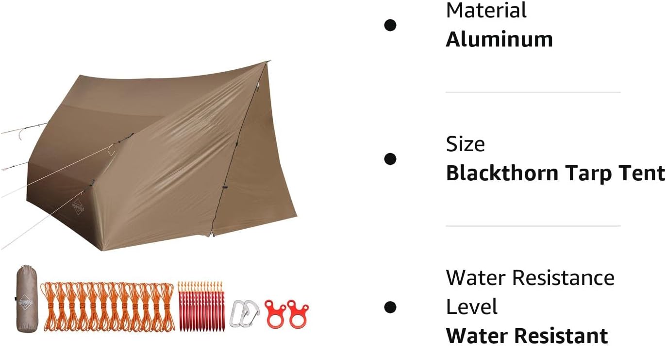 FULL COVERAGE With a dimension of 102″ x 94″ on ground, the Blackthorn Zippered Tarp provides excellent capacity and clearance. It can accommodate 3-4 adults with an adjustable height for bigger head room allowing you to move inside your tarp without feeling restricted.