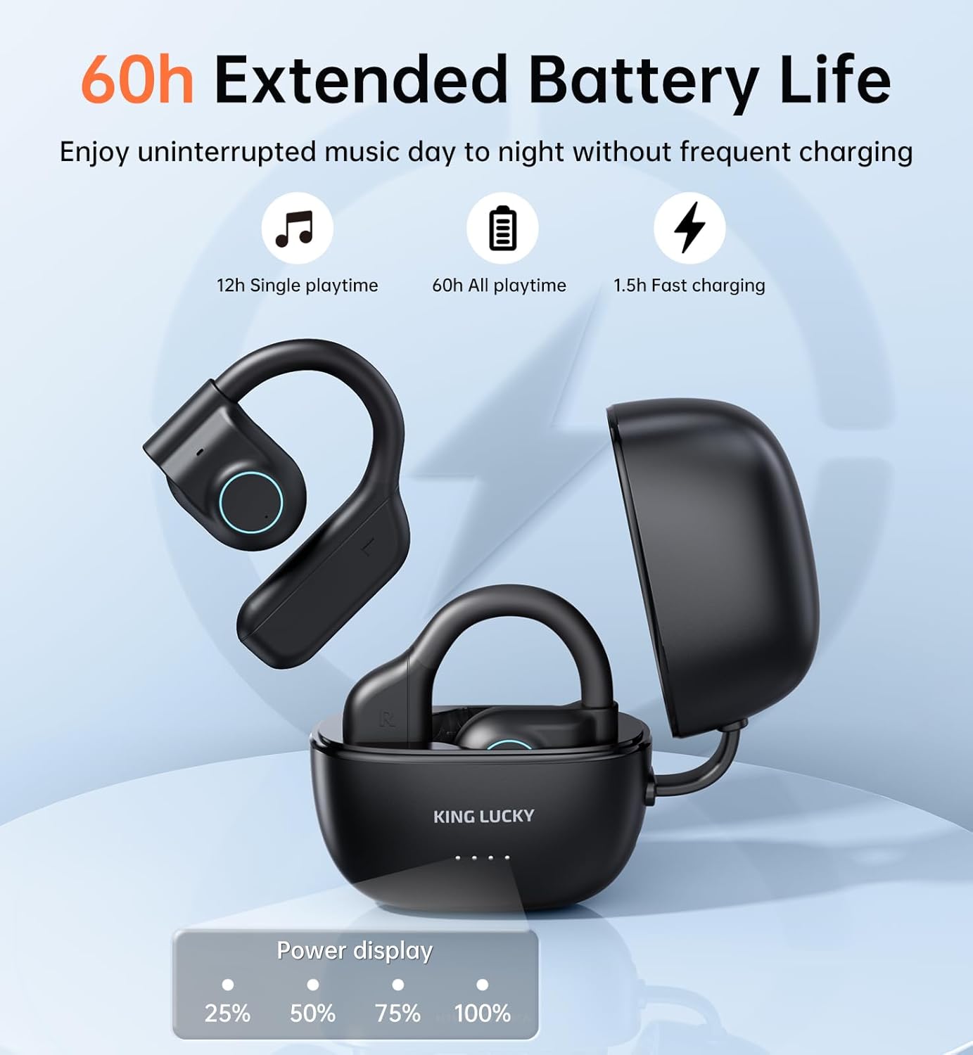 [Watchable 60-Hour Battery Life] Charging case provides up to 60H of total battery life, Kinglucky true open earbuds can accompany you throughout your day much better. The dot indication conveniently displays the remaining battery life of the charging case, so you always know when it’s time to recharge.