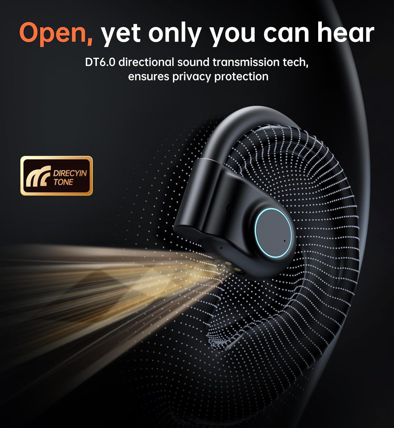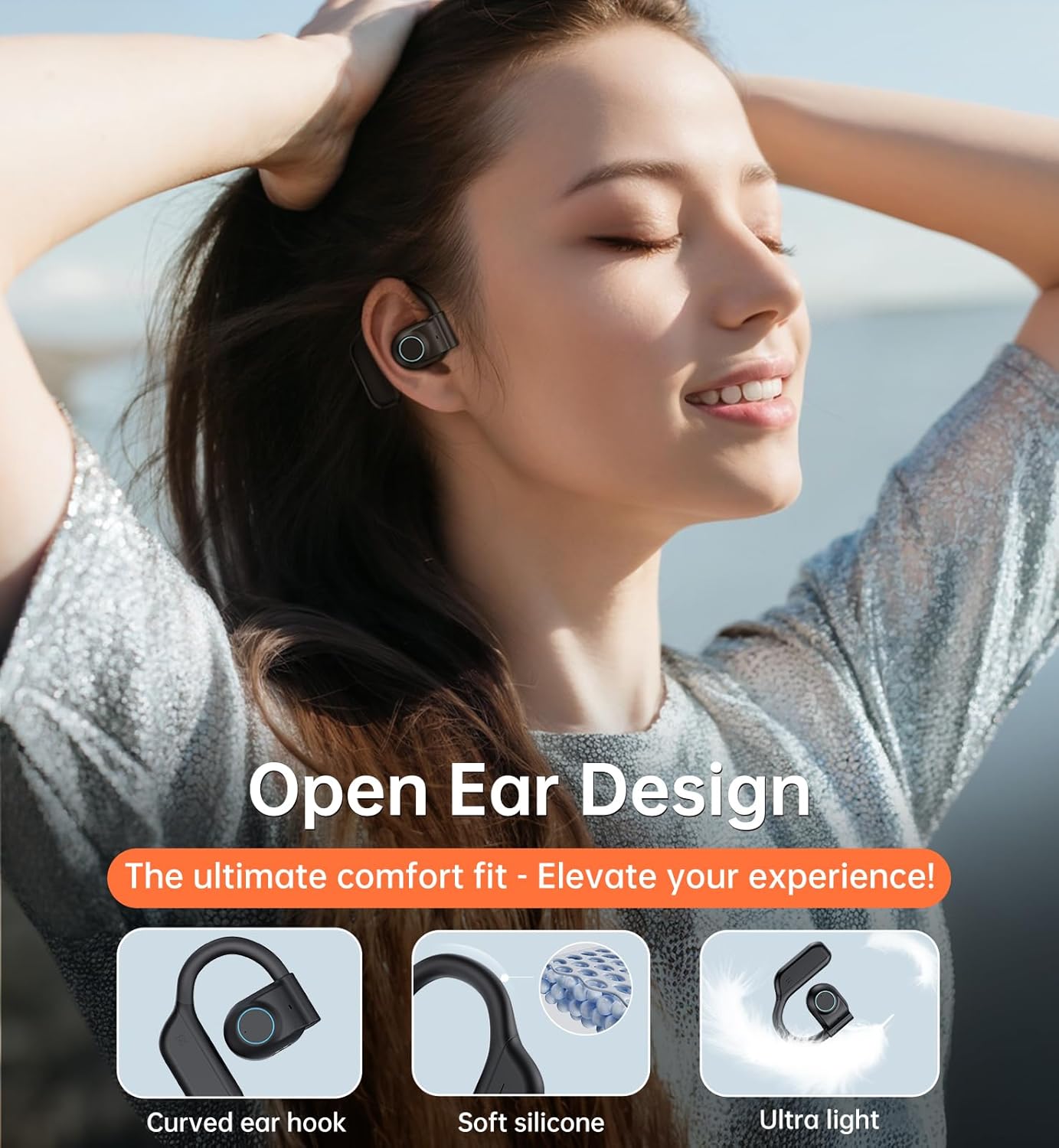 Open Ear Headphones Wireless Bluetooth 5.3, Long-Lasting Comfort fit Ears, Rich Bass, 60H Playtime, Open Earbuds with Mics for Crystal-Clear Calls, IPX6, Earbuds with Earhooks for Running, Walking