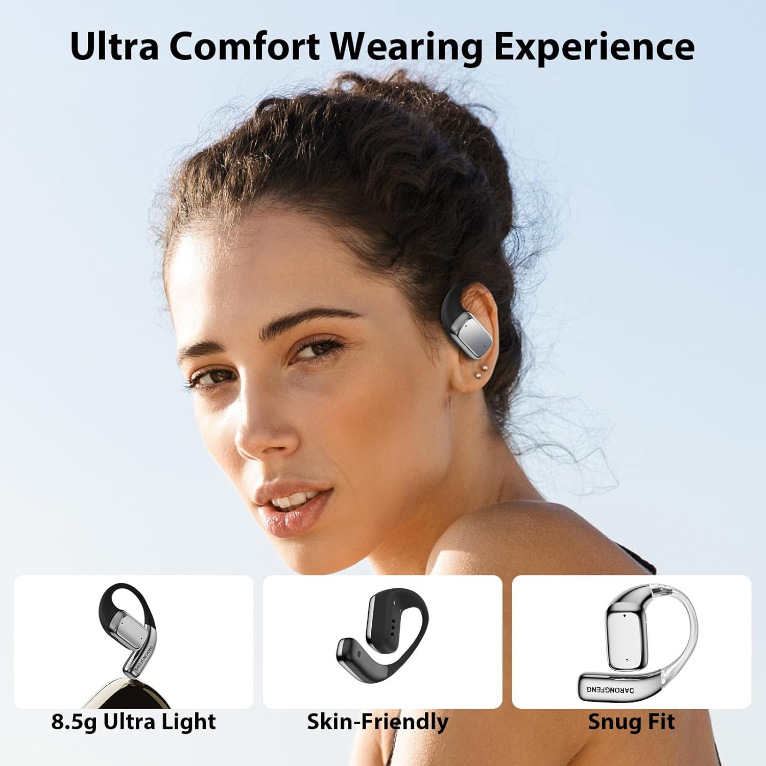 【Extremely Comfortable & Secure Fit】 Our headphones are designed for all-day wear without causing discomfort or pain. Each earbud weighs only 8.5g, and the outer surface is made of liquid skin-friendly silicone material, eliminating any pressure points. The ear hook is embedded with flexible memory metal for a secure fit that stays in place during activities.