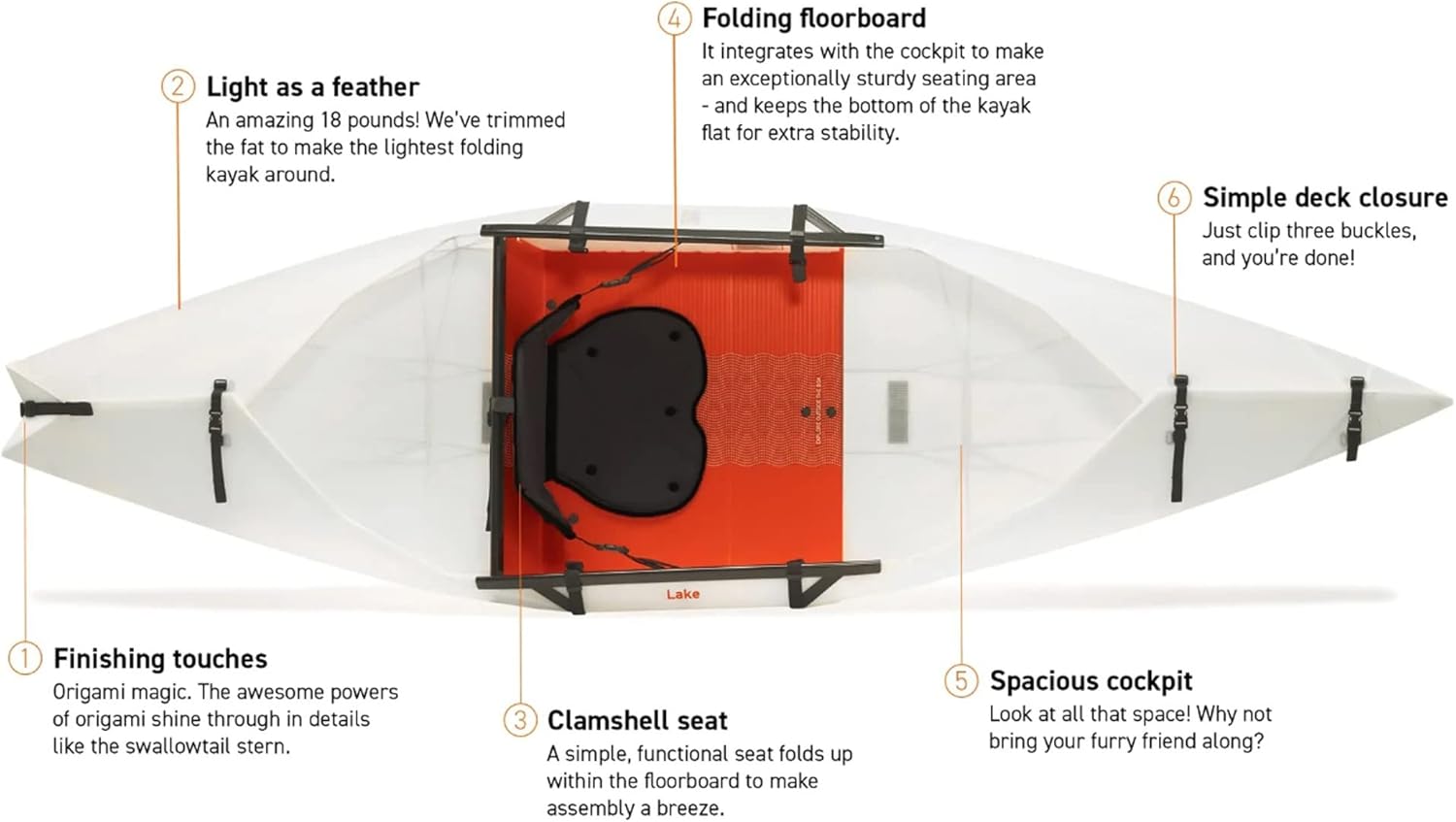 SPECS & MEASUREMENTS: At 17 Lbs, this origami kayak weighs half of a traditional kayak. The 9″x 32″ kayak that folds down to an unbelievably compact box – 42″ x 10″ x 18″. Cockpit size: 66″ x 44″. Capacity for a max. of 250 Lbs. Max paddler height: 6’4″. Color: Black