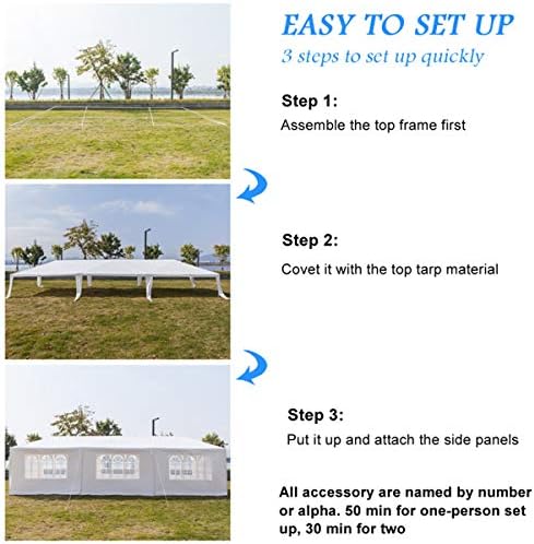 【ATTENTATION 】 We advise customers to never leave patio tent up overnight or under bad weather conditions. We will not be responsible for such weather damages. It is up to customers decision to determine the correct weather condition when you choose the party tent. Warning: Polyethylene Fabric of party tent is not fire proof, pls be away from sources of fire. Please assemble the tent with you your friend or who can help. Party canopy wedding tent.
