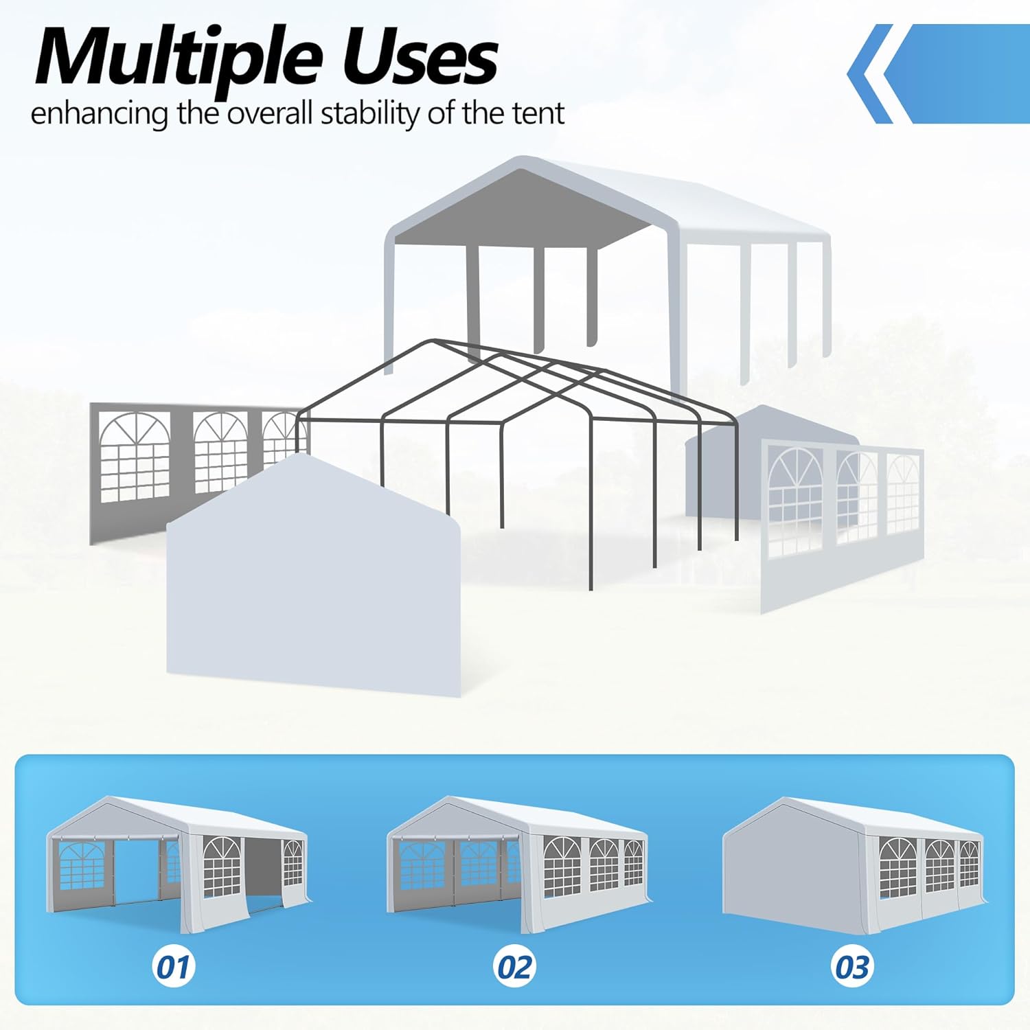 【More Stable Design】Our canopy wedding tent includes Strong Grip, Strong Rope and Sand Bags to ensure the stability of the party tent. The metal stakes ensure that the tent to the ground deeply. We offer a variety of tent sizes for you to choose from.