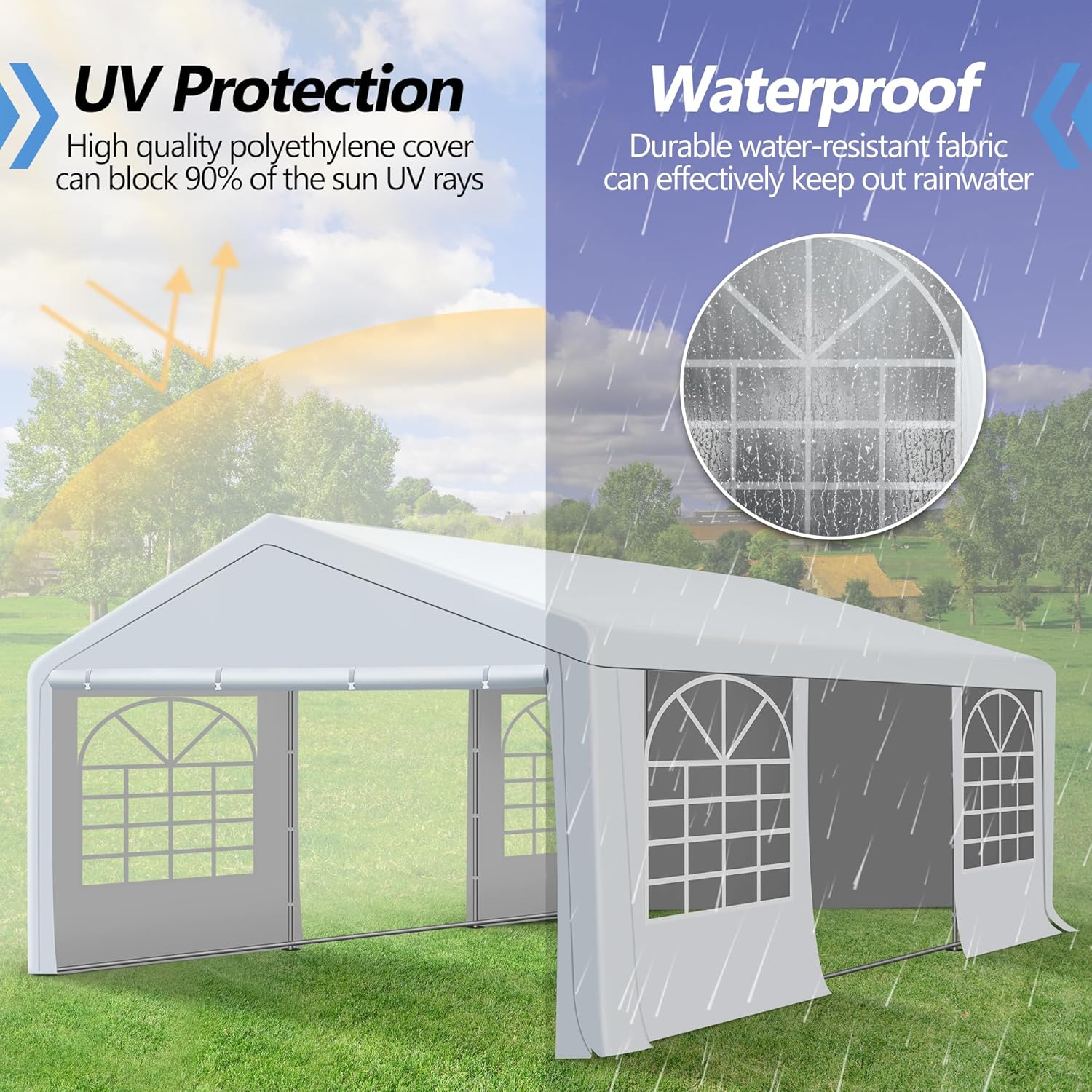 【Waterproof & UV Protection】Upgrade your outdoor gathering with heavy duty party tent featuring heavy-duty galvanized steel tubes and a rust-resistant design, ensuring lasting durability in various weather conditions. The 180g PE material that is not only waterproof but also UV protected, blocking out harmful rays.