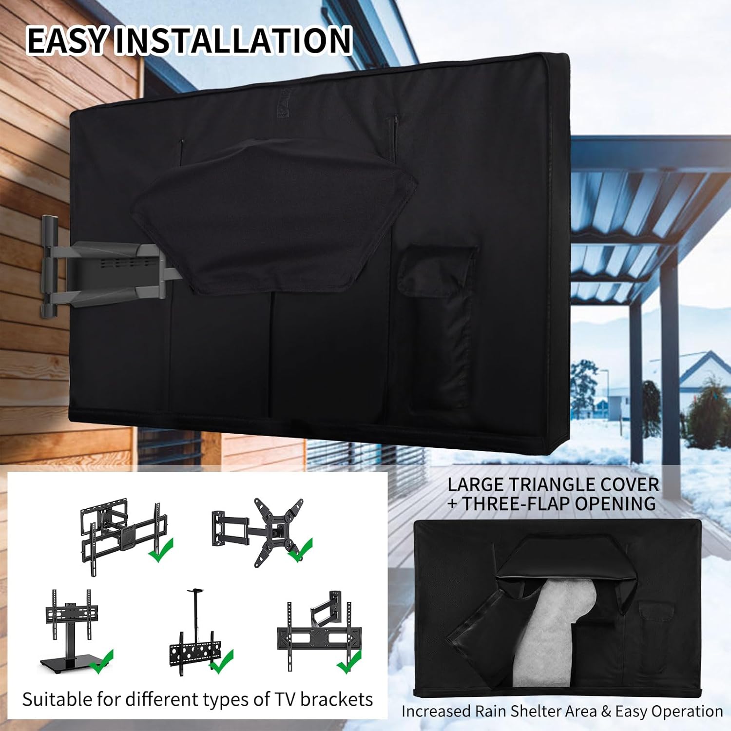 【Enhanced Rain Protection Design】The outdoor TV cover features a large triangular cover and a three-door design, providing a larger rain-shielding area. It effectively prevents rainwater from seeping into the TV. The Velcro closure is suitable for all kinds of TV mounts, ensuring a perfect fit for the TV cover.